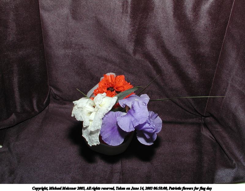 Picture #76: Patriotic flowers for flag day #2 800x623, 94,078 bytes (92K), (html file) Copyright, Michael Meissner 2003, All rights reserved Olympus C-2100UZ camera f/7.0, ISO 100, 1/250 sec, 7.8mm, manual mode, SHQ, matrix metering 35mm equivalent focal length 43.0mm Taken by Michael Meissner on June 14, 2003 06:58:00 Last modified on June 14, 2003 at 19:38 Shutter speed of 1/125 or 1/250 may indicate use of flash |