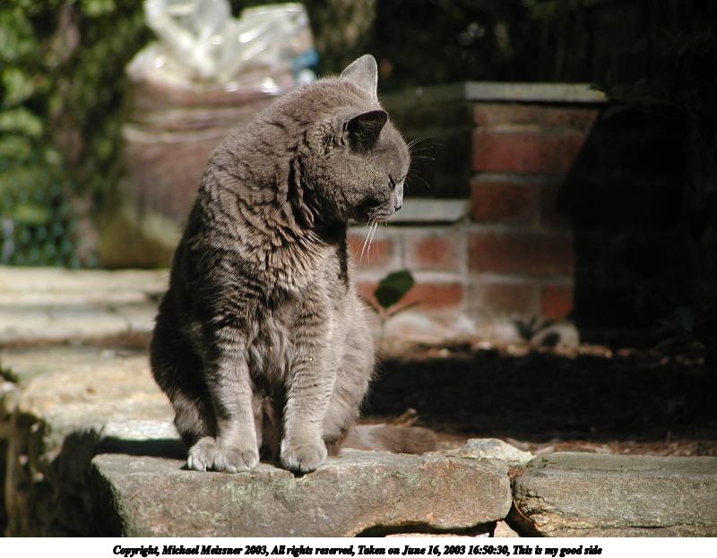Picture #37: This is my good side 800x623, 74,887 bytes (74K), (html file) Copyright, Michael Meissner 2003, All rights reserved Olympus C-2100UZ camera f/2.8, ISO 100, 1/400 sec, 41.3mm, auto mode, SHQ, matrix metering 35mm equivalent focal length 229.0mm Taken by Michael Meissner on June 16, 2003 16:50:30 Last modified on June 17, 2003 at 12:11 |