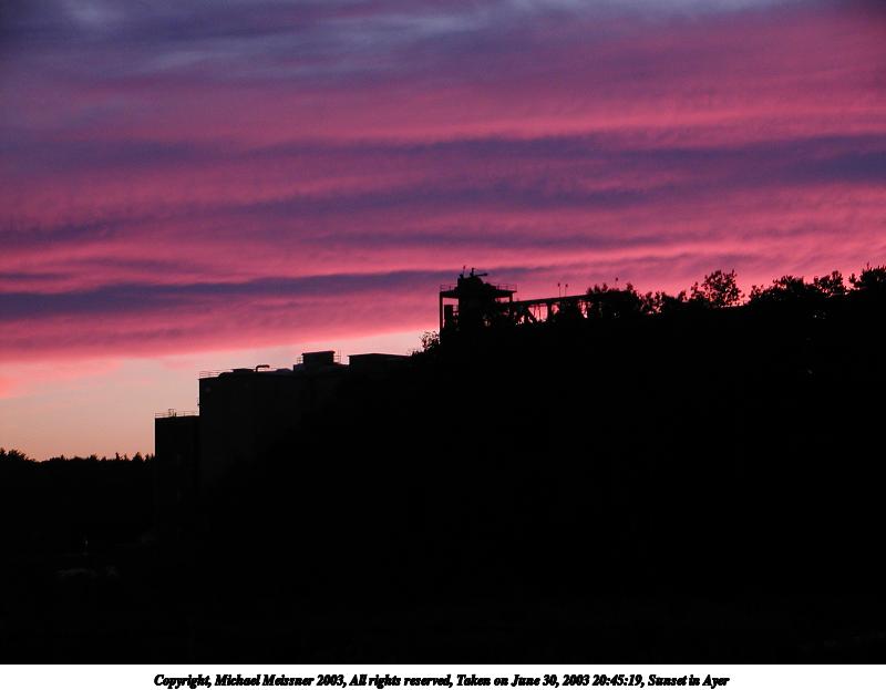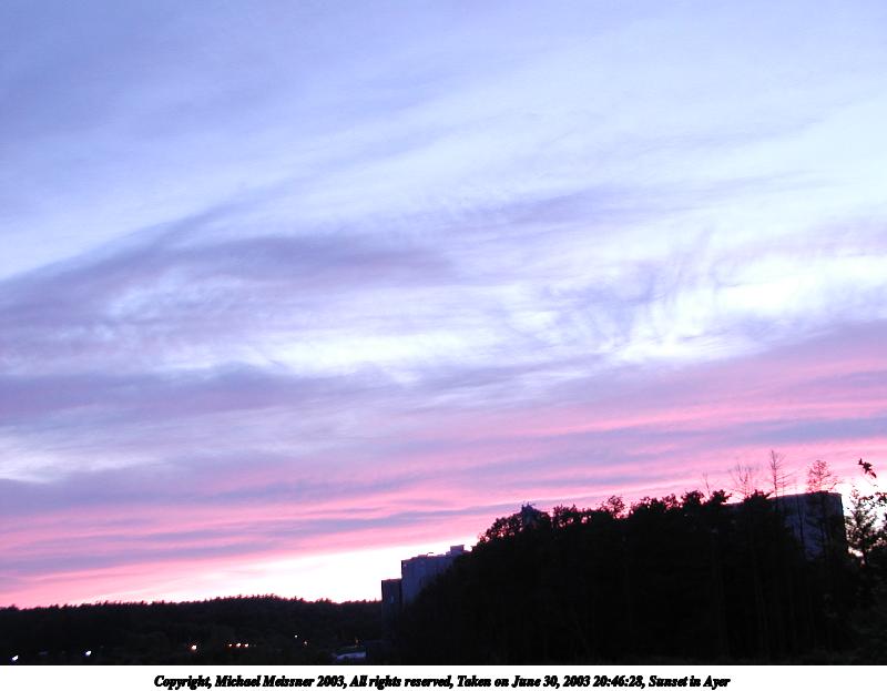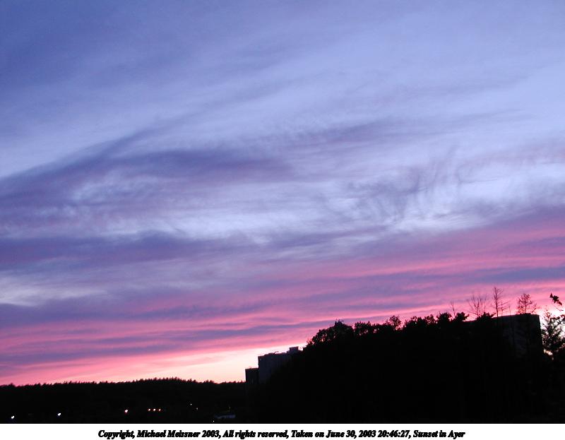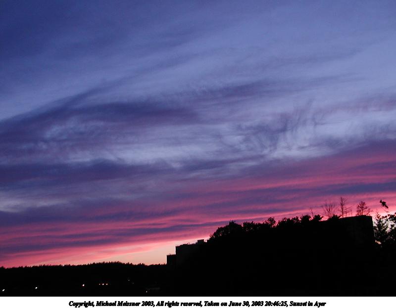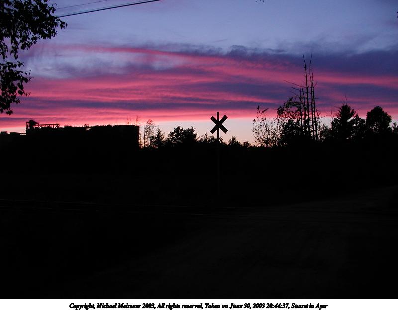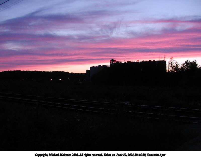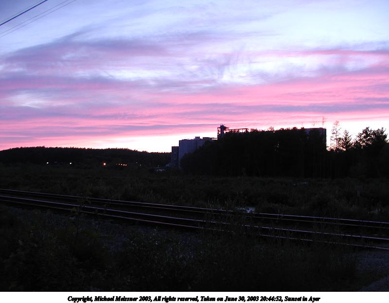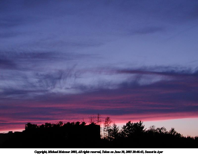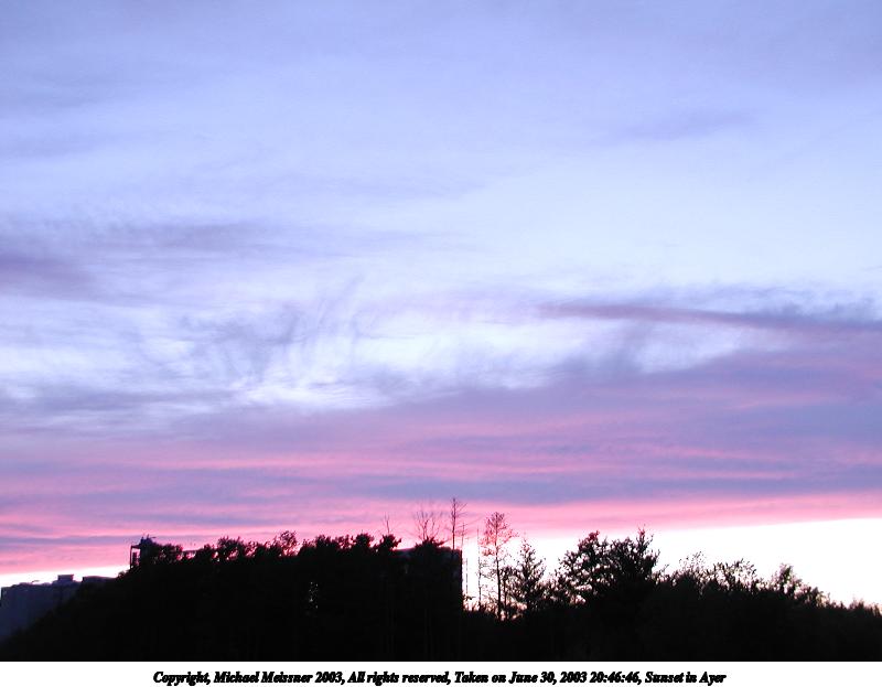 Picture #6: Sunset in Ayer #13 800x623, 66,446 bytes (65K), (html file) Copyright, Michael Meissner 2003, All rights reserved Olympus C-2100UZ camera f/2.8, ISO 100, 1/8 sec, 9.2mm, auto mode, SHQ, fluorescent, spot metering 35mm equivalent focal length 51.0mm Taken by Michael Meissner on June 30, 2003 20:47:09 Last modified on July 01, 2003 at 13:19 |
