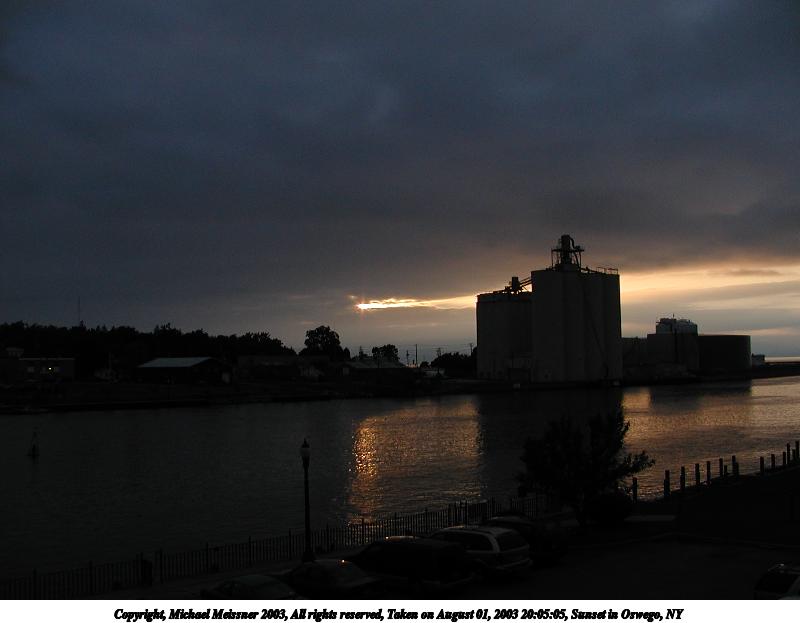 Picture #184: Sunset in Oswego, NY 800x623, 42,567 bytes (42K), (html file) Copyright, Michael Meissner 2003, All rights reserved Olympus C-2100UZ camera f/3.2, ISO 100, 1/500 sec, 7.0mm, auto mode, SHQ, spot metering 35mm equivalent focal length 39.0mm Taken by Michael Meissner on August 01, 2003 20:04:50 Last modified on September 02, 2003 at 11:35 |