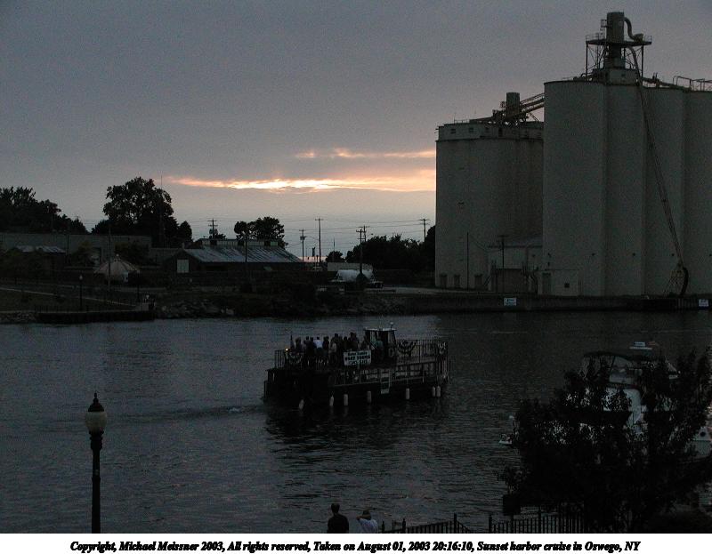 Picture #182: Sunset harbor cruise in Oswego, NY 800x623, 67,148 bytes (66K), (html file) Copyright, Michael Meissner 2003, All rights reserved Olympus C-2100UZ camera f/3.5, ISO 400, 1/500 sec, 14.7mm, auto mode, SHQ, matrix metering 35mm equivalent focal length 82.0mm Taken by Michael Meissner on August 01, 2003 20:16:10 Last modified on September 02, 2003 at 11:35 |
