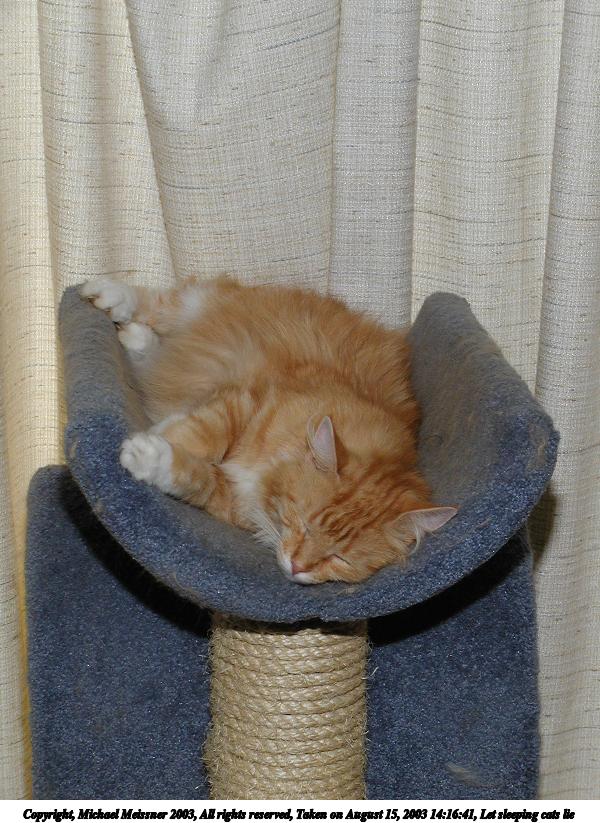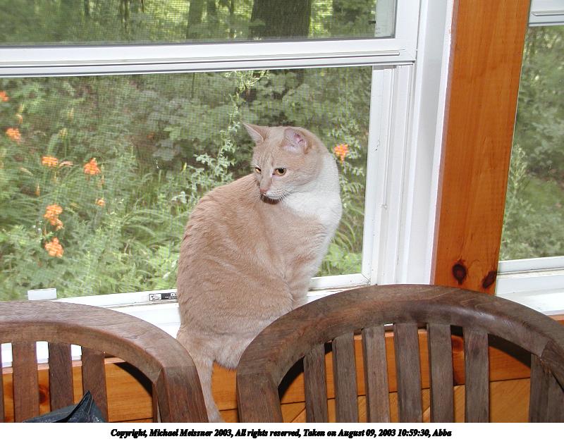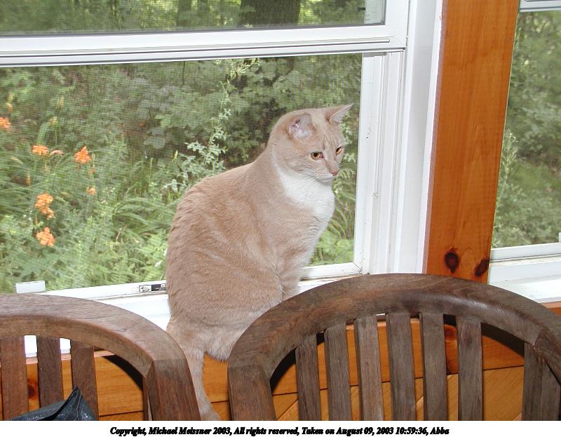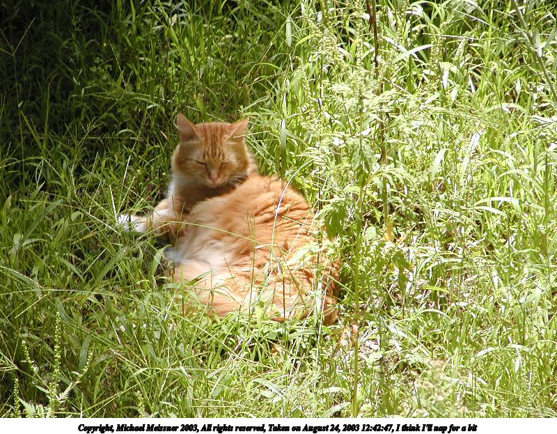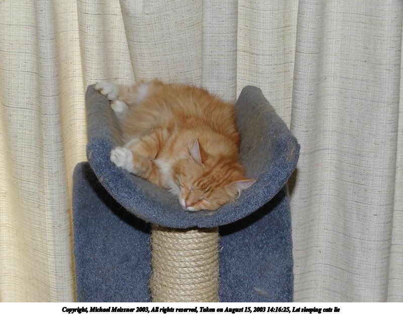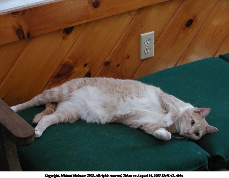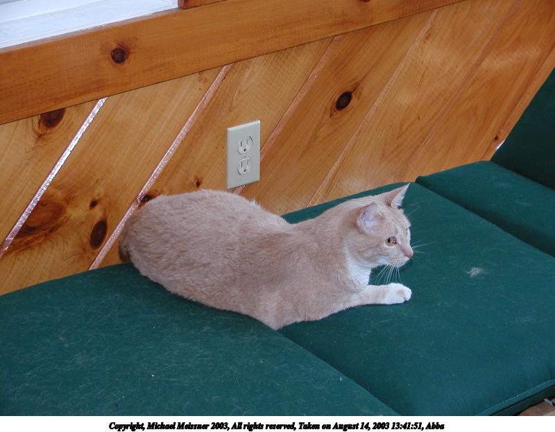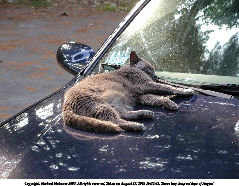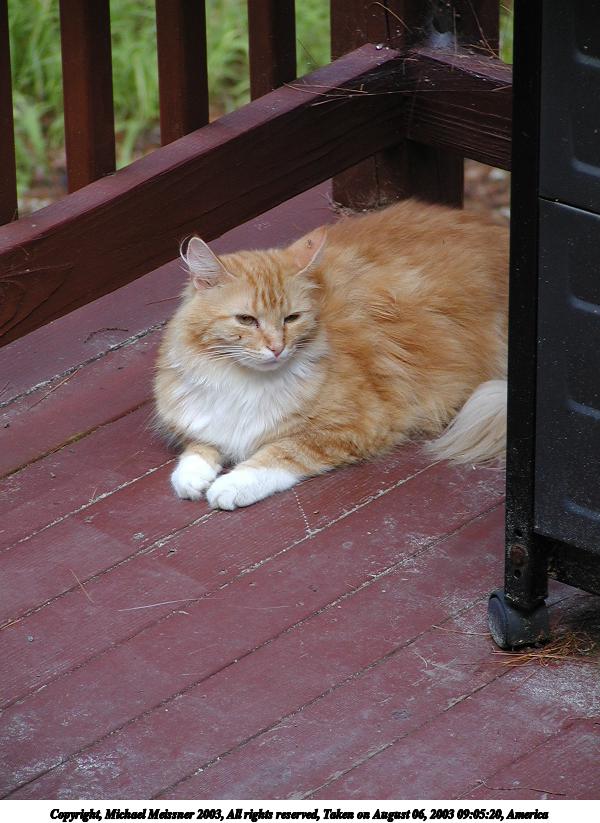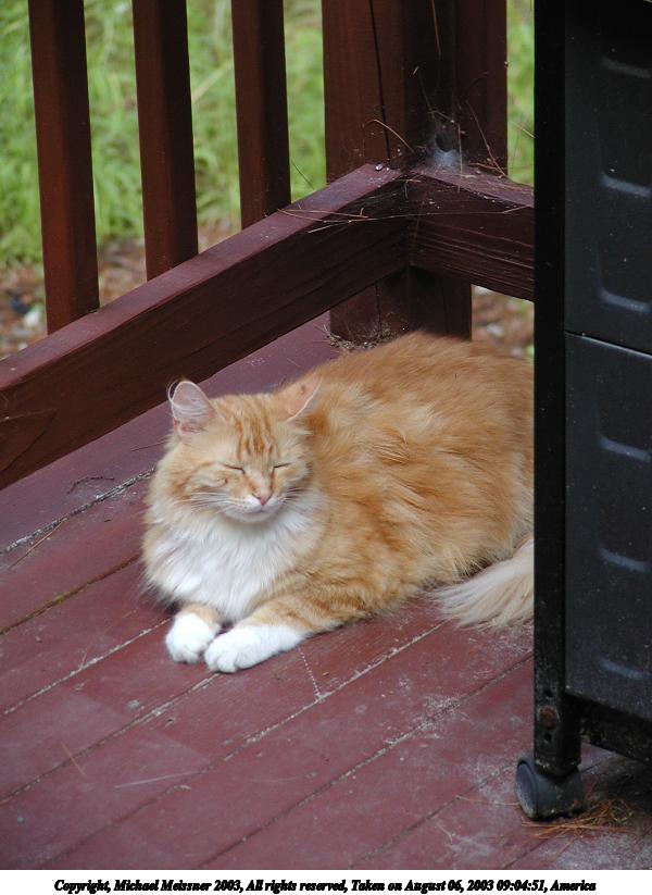 Picture #75: Those lazy, hazy cat days of August #2 800x623, 97,794 bytes (96K), (html file) Copyright, Michael Meissner 2003, All rights reserved Olympus C-2100UZ camera f/2.8, ISO 100, 1/250 sec, 24.2mm, auto mode, SHQ, matrix metering 35mm equivalent focal length 134.0mm Taken by Michael Meissner on August 29, 2003 16:23:33 Last modified on September 02, 2003 at 11:35 Shutter speed of 1/125 or 1/250 may indicate use of flash |