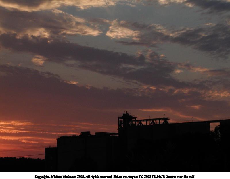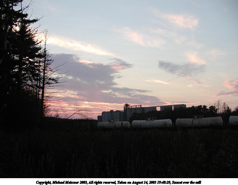 Picture #164: Sunset over the mill #3 800x423, 36,408 bytes (36K), (html file) Copyright, Michael Meissner 2003, All rights reserved Olympus C-2100UZ camera f/2.8, ISO 100, 1/400 sec, 7.0mm, auto mode, SHQ, spot metering 35mm equivalent focal length 39.0mm Taken by Michael Meissner on August 14, 2003 19:49:23 Last modified on September 02, 2003 at 11:35 |