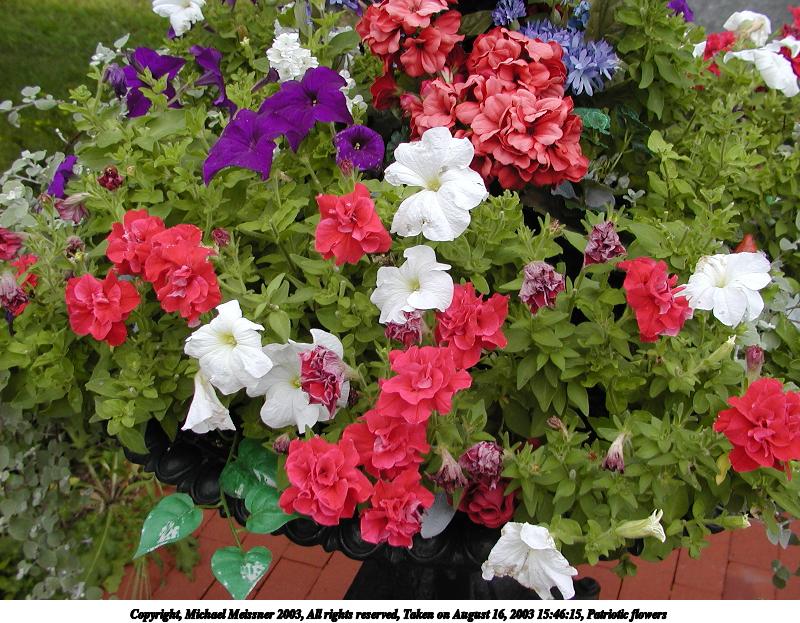 Picture #154: Patriotic flowers #2 800x623, 136,446 bytes (134K), (html file) Copyright, Michael Meissner 2003, All rights reserved Olympus C-2100UZ camera f/5.6, ISO 100, 1/100 sec, 8.4mm, aperture priority, SHQ, matrix metering, macro 35mm equivalent focal length 47.0mm Taken by Michael Meissner on August 16, 2003 15:46:23 Last modified on September 02, 2003 at 11:35 |