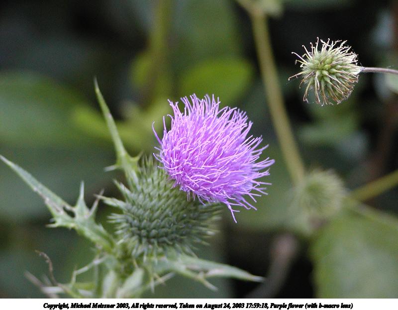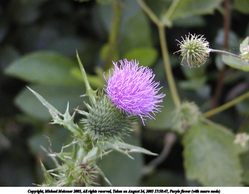 Picture #138: Purple flower (with macro mode) 800x623, 67,704 bytes (67K), (html file) Copyright, Michael Meissner 2003, All rights reserved Olympus C-2100UZ camera f/2.8, ISO 200, 1/100 sec, 22.3mm, auto mode, SHQ, matrix metering, macro 35mm equivalent focal length 124.0mm Taken by Michael Meissner on August 24, 2003 17:58:47 Last modified on September 02, 2003 at 11:35 |