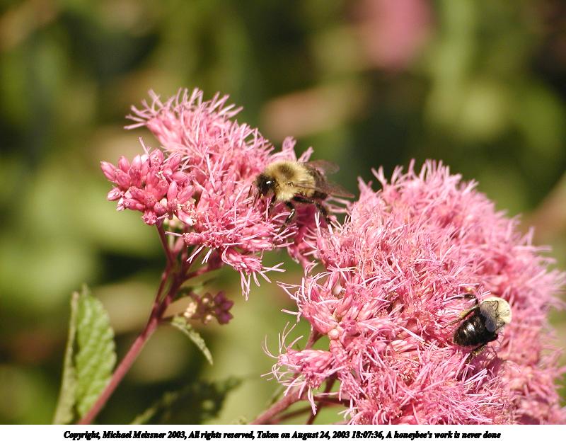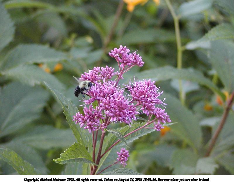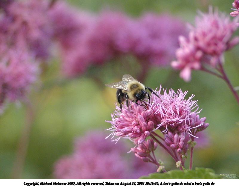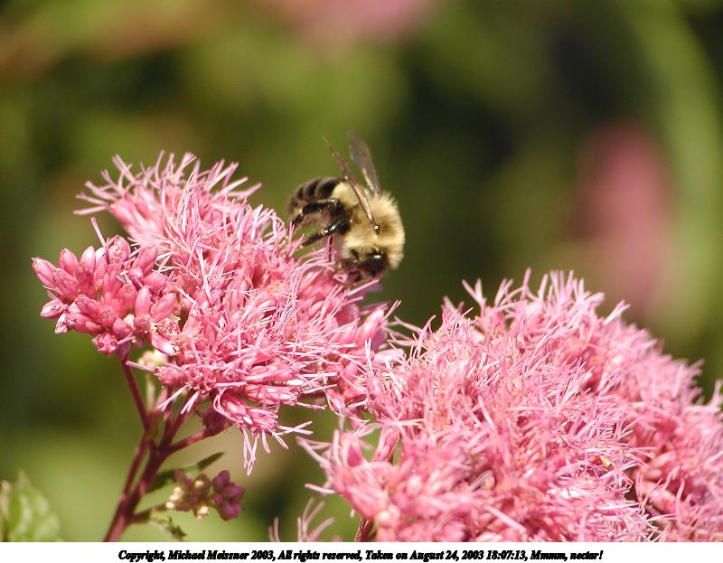 Picture #130: A bee's gotta do what a bee's gotta do 800x623, 61,928 bytes (61K), (html file) Copyright, Michael Meissner 2003, All rights reserved Olympus C-2100UZ camera f/2.8, ISO 200, 1/125 sec, 24.2mm, auto mode, SHQ, matrix metering 35mm equivalent focal length 134.0mm Taken by Michael Meissner on August 24, 2003 18:16:26 Last modified on September 02, 2003 at 11:35 Shutter speed of 1/125 or 1/250 may indicate use of flash |