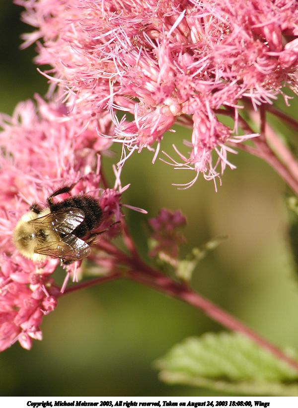 Picture #136: Bee #2 800x623, 76,539 bytes (75K), (html file) Copyright, Michael Meissner 2003, All rights reserved Olympus C-2100UZ camera f/2.8, ISO 200, 1/125 sec, 25.2mm, auto mode, SHQ, matrix metering, macro 35mm equivalent focal length 140.0mm Taken by Michael Meissner on August 24, 2003 18:00:57 Last modified on September 02, 2003 at 11:35 Shutter speed of 1/125 or 1/250 may indicate use of flash |