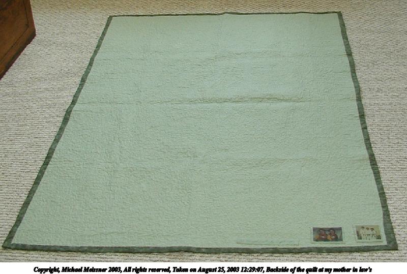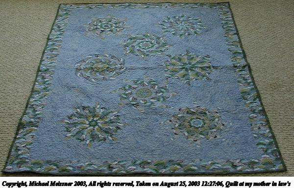 Picture #116: Quilt at my mother in law's 600x384, 69,675 bytes (69K), (html file) Copyright, Michael Meissner 2003, All rights reserved Olympus C-2100UZ camera f/2.8, ISO 100, 1/125 sec, 7.8mm, auto mode, SHQ, cloudy, spot metering 35mm equivalent focal length 43.0mm Taken by Michael Meissner on August 25, 2003 12:27:06 Last modified on September 02, 2003 at 11:35 Shutter speed of 1/125 or 1/250 may indicate use of flash |