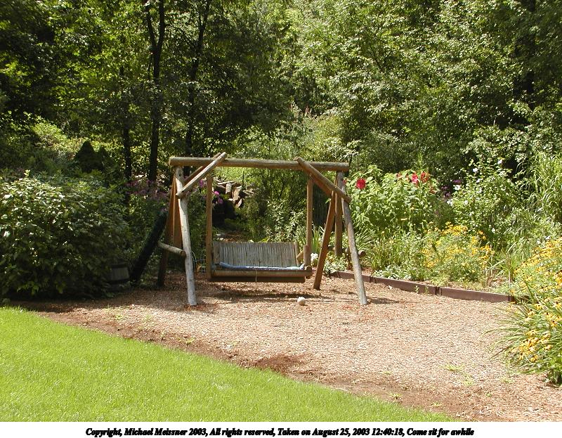 Picture #107: Come sit for awhile 800x623, 194,963 bytes (191K), (html file) Copyright, Michael Meissner 2003, All rights reserved Olympus C-2100UZ camera f/4.0, ISO 100, 1/500 sec, 11.3mm, auto mode, SHQ, cloudy, matrix metering 35mm equivalent focal length 63.0mm Taken by Michael Meissner on August 25, 2003 12:40:18 Last modified on September 02, 2003 at 11:35 |