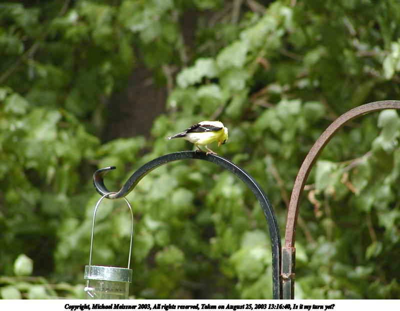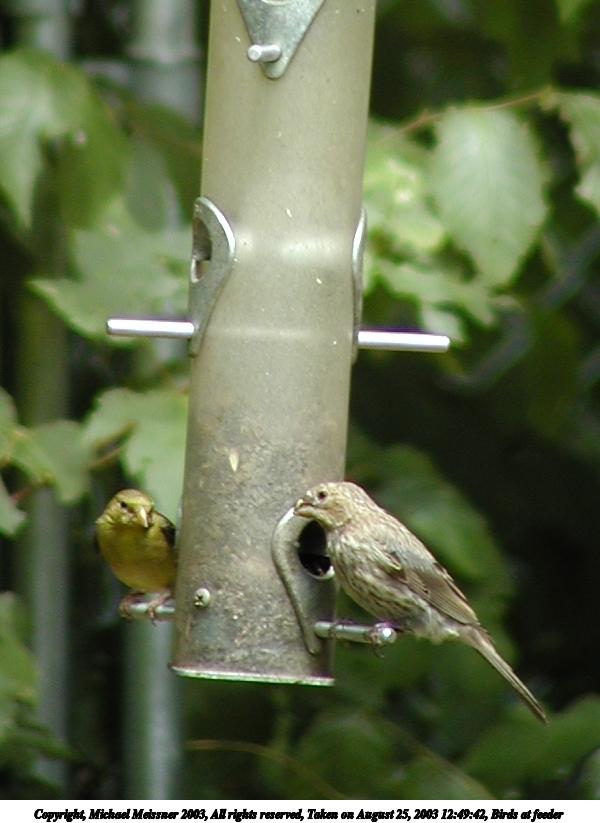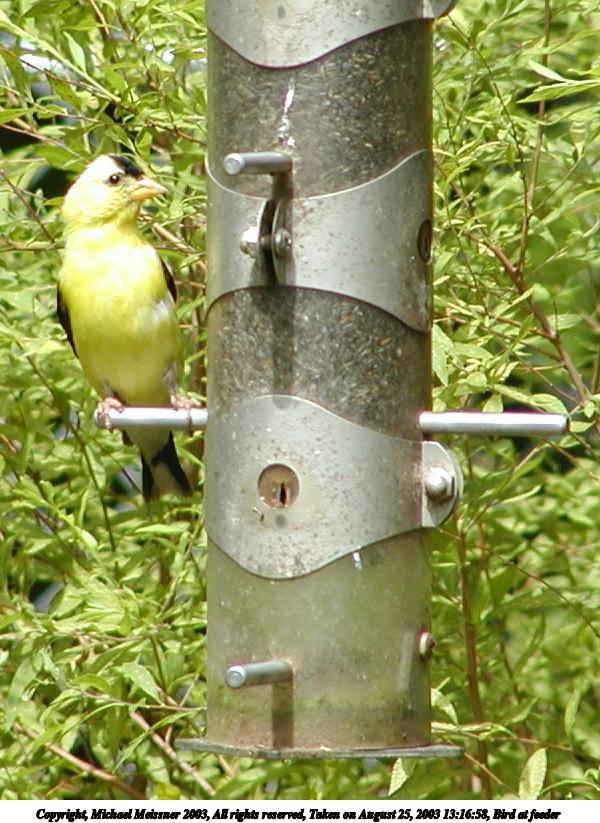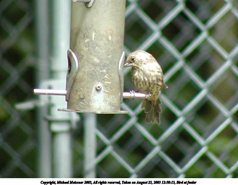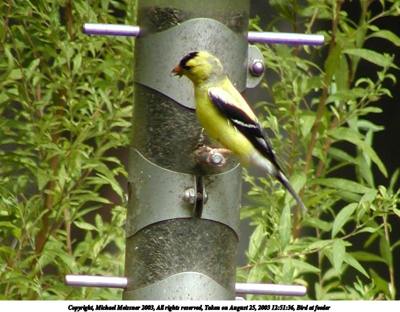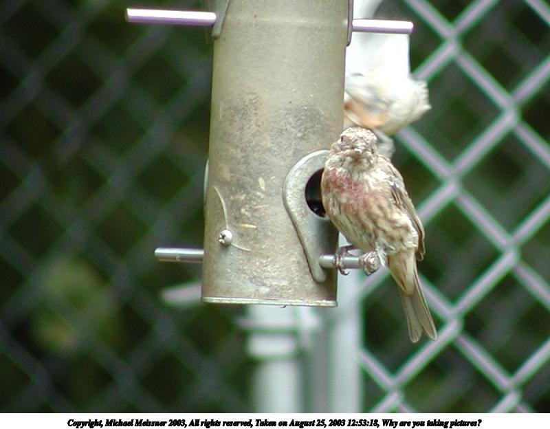 Picture #91: Bird at feeder 800x623, 64,398 bytes (63K), (html file) Copyright, Michael Meissner 2003, All rights reserved Olympus C-2100UZ camera f/3.5, ISO 100, 1/250 sec, 70.0mm, auto mode, SHQ, sunny, matrix metering 35mm equivalent focal length 388.0mm Taken by Michael Meissner on August 25, 2003 12:50:13 Last modified on September 02, 2003 at 11:35 Shutter speed of 1/125 or 1/250 may indicate use of flash |