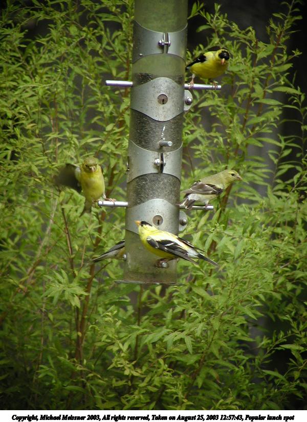 Picture #94: Birds at feeder 800x623, 115,044 bytes (113K), (html file) Copyright, Michael Meissner 2003, All rights reserved Olympus C-2100UZ camera f/3.2, ISO 100, 1/400 sec, 61.0mm, auto mode, SHQ, sunny, matrix metering 35mm equivalent focal length 338.0mm Taken by Michael Meissner on August 25, 2003 12:48:55 Last modified on September 02, 2003 at 11:35 |