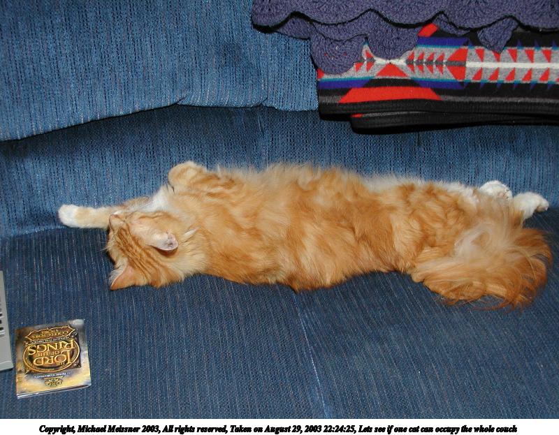 Picture #74: Lets see if one cat can occupy the whole couch 800x623, 120,814 bytes (118K), (html file) Copyright, Michael Meissner 2003, All rights reserved Olympus C-2100UZ camera f/2.8, ISO 100, 1/50 sec, 12.0mm, auto mode, SHQ, matrix metering 35mm equivalent focal length 67.0mm Taken by Michael Meissner on August 29, 2003 22:24:25 Last modified on September 02, 2003 at 11:35 |
