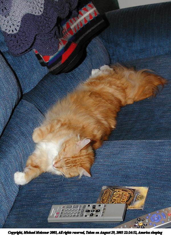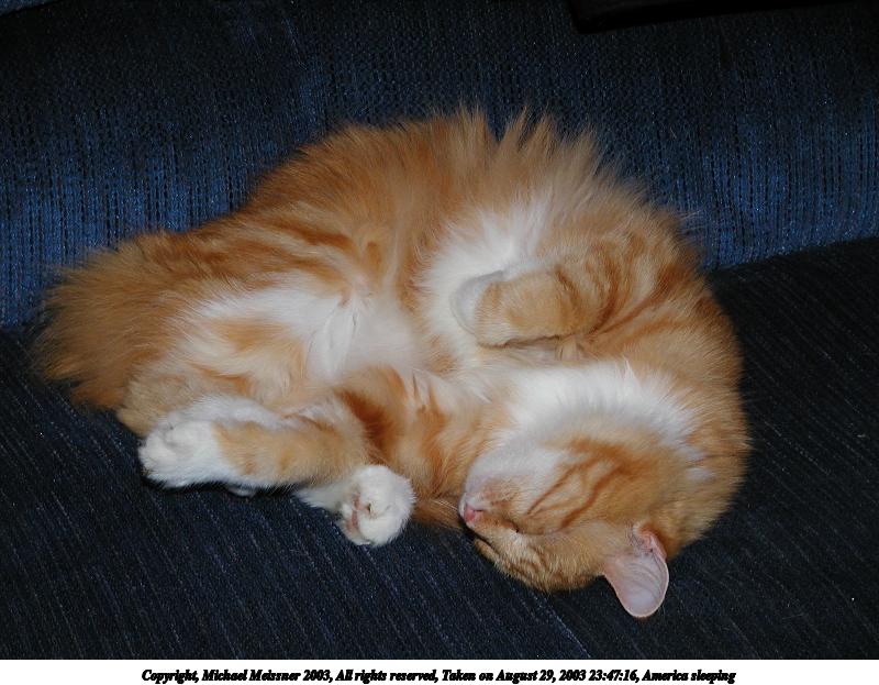 Picture #72: America sleeping #2 800x623, 80,746 bytes (79K), (html file) Copyright, Michael Meissner 2003, All rights reserved Olympus C-2100UZ camera f/2.8, ISO 100, 1/125 sec, 27.3mm, auto mode, SHQ, matrix metering 35mm equivalent focal length 151.0mm Taken by Michael Meissner on August 29, 2003 23:47:16 Last modified on September 02, 2003 at 11:35 Shutter speed of 1/125 or 1/250 may indicate use of flash |