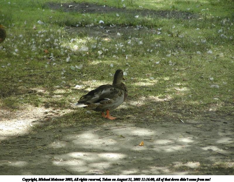 Picture #44: All of that down didn't come from me! 800x623, 123,636 bytes (121K), (html file) Copyright, Michael Meissner 2003, All rights reserved Olympus C-2100UZ camera f/2.8, ISO 100, 1/50 sec, 37.4mm, auto mode, SHQ, sunny, matrix metering 35mm equivalent focal length 208.0mm Taken by Michael Meissner on August 31, 2003 11:16:00 Last modified on September 02, 2003 at 11:35 |