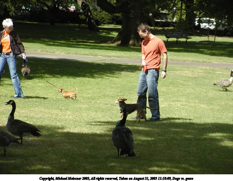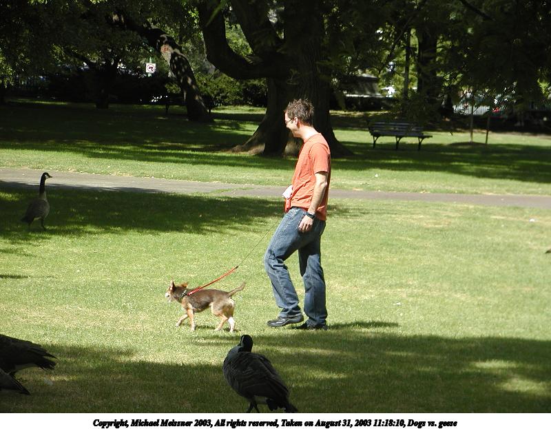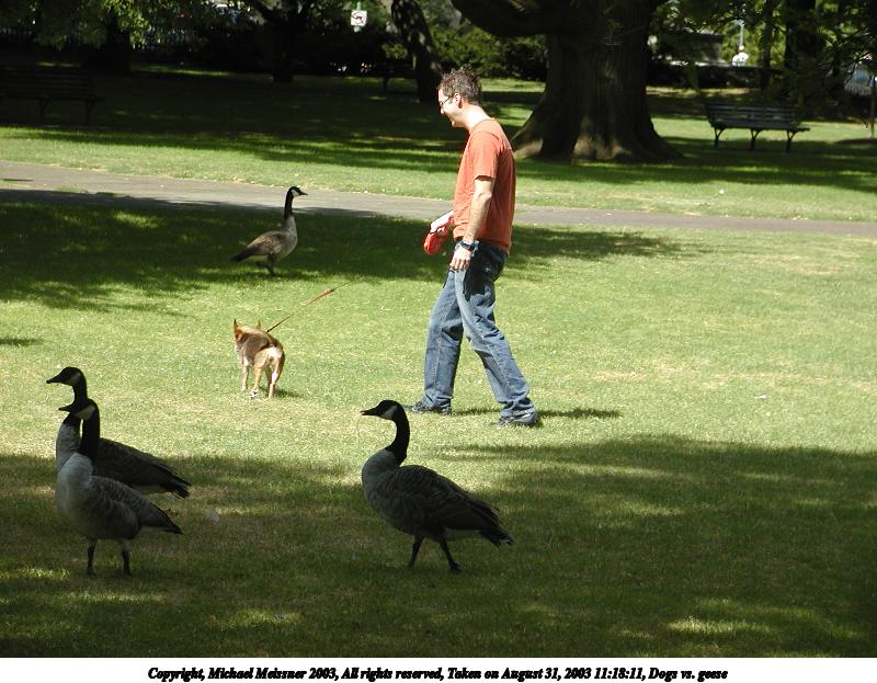 Picture #39: Dogs vs. geese #3 800x623, 101,575 bytes (100K), (html file) Copyright, Michael Meissner 2003, All rights reserved Olympus C-2100UZ camera f/2.8, ISO 100, 1/320 sec, 28.5mm, auto mode, SHQ, sunny, matrix metering 35mm equivalent focal length 158.0mm Taken by Michael Meissner on August 31, 2003 11:18:11 Last modified on September 02, 2003 at 11:35 |