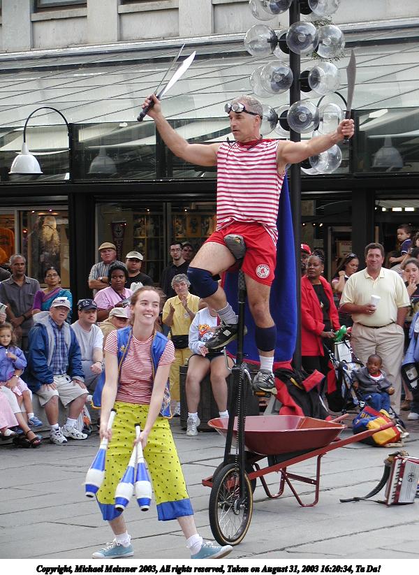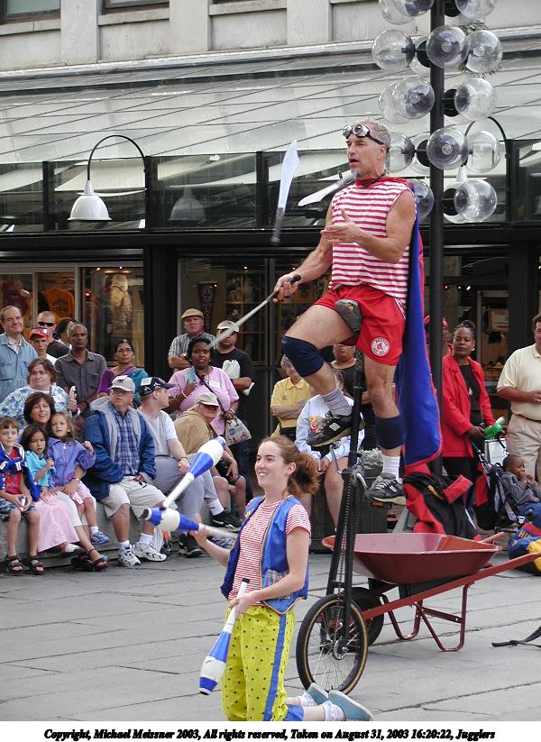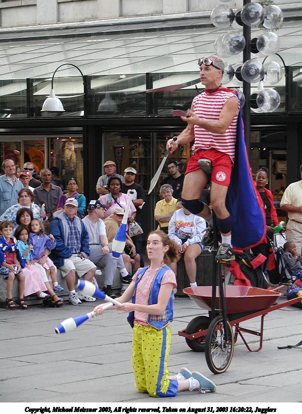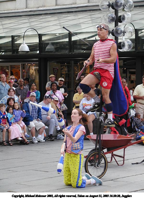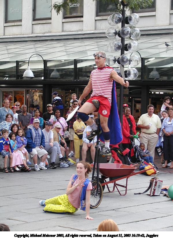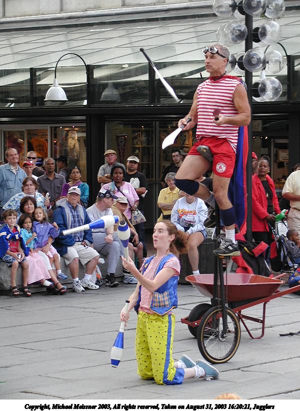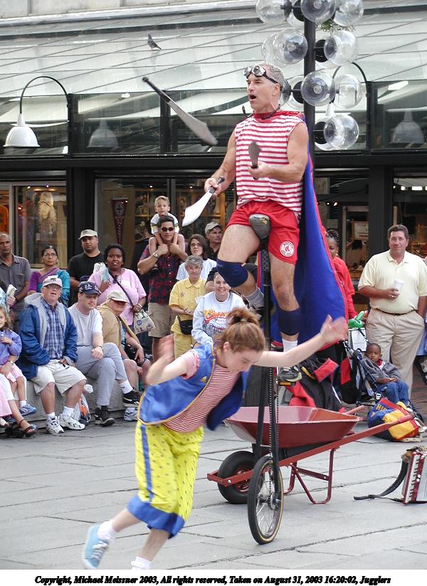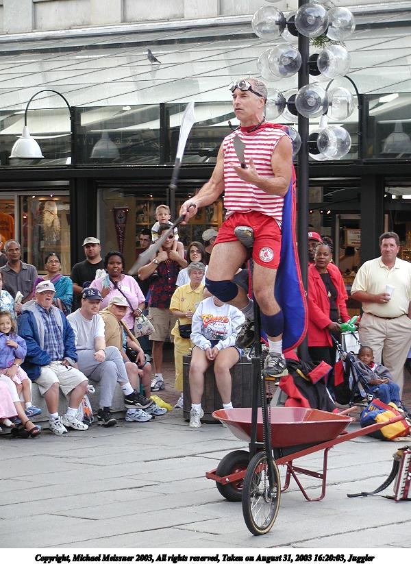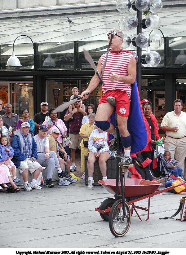 Picture #2: Juggler with the cups 600x823, 73,482 bytes (72K), (html file) Copyright, Michael Meissner 2003, All rights reserved Olympus C-2100UZ camera f/3.2, ISO 100, 1/125 sec, 61.0mm, auto mode, SHQ, matrix metering 35mm equivalent focal length 338.0mm Taken by Michael Meissner on August 31, 2003 13:04:39 Last modified on September 02, 2003 at 11:35 Shutter speed of 1/125 or 1/250 may indicate use of flash |