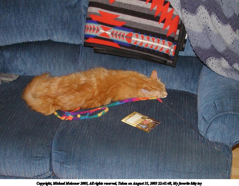 Picture #12: My favorite kitty toy 800x623, 116,798 bytes (115K), (html file) Copyright, Michael Meissner 2003, All rights reserved Olympus C-2100UZ camera f/2.8, ISO 100, flash, 1/60 sec, 13.0mm, auto mode, SHQ, matrix metering 35mm equivalent focal length 72.0mm Taken by Michael Meissner on August 31, 2003 22:41:31 Last modified on September 02, 2003 at 11:35 |