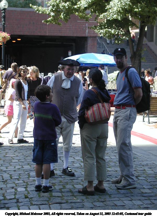 Picture #10: Costumed tour guide 600x823, 106,266 bytes (104K), (html file) Copyright, Michael Meissner 2003, All rights reserved Olympus C-2100UZ camera f/2.8, ISO 100, 1/160 sec, 16.2mm, auto mode, SHQ, sunny, matrix metering 35mm equivalent focal length 90.0mm Taken by Michael Meissner on August 31, 2003 12:45:05 Last modified on September 02, 2003 at 11:35 |