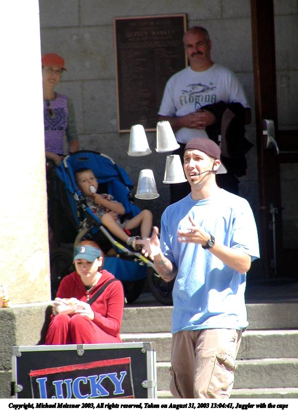 Picture #1: Juggler with the cups #2 600x823, 76,475 bytes (75K), (html file) Copyright, Michael Meissner 2003, All rights reserved Olympus C-2100UZ camera f/3.2, ISO 100, 1/125 sec, 61.0mm, auto mode, SHQ, matrix metering 35mm equivalent focal length 338.0mm Taken by Michael Meissner on August 31, 2003 13:04:41 Last modified on September 02, 2003 at 11:35 Shutter speed of 1/125 or 1/250 may indicate use of flash |