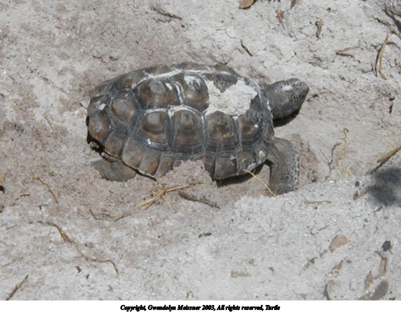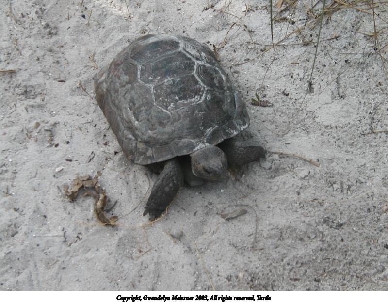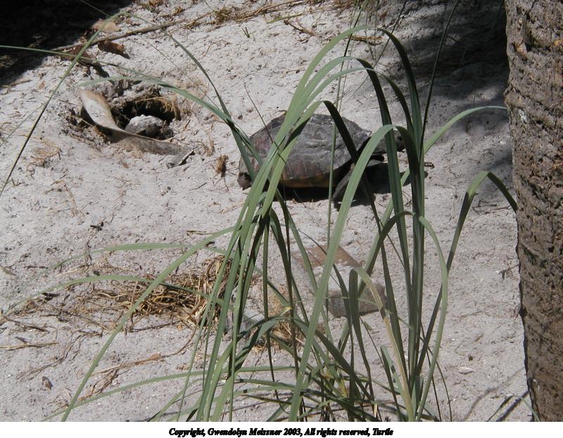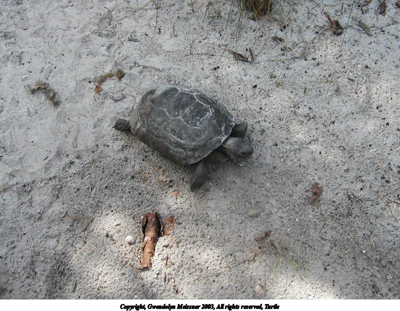 Picture #5: Turtle #5 800x623, 111,547 bytes (109K), (html file) Copyright, Gwendolyn Meissner 2003, All rights reserved Olympus D-510Z camera f/8.6, ISO 100, 1/400 sec, 15.7mm, auto mode, HQ, matrix metering 35mm equivalent focal length 102.0mm Taken by Gwendolyn Meissner Last modified on May 29, 2003 at 10:34 |