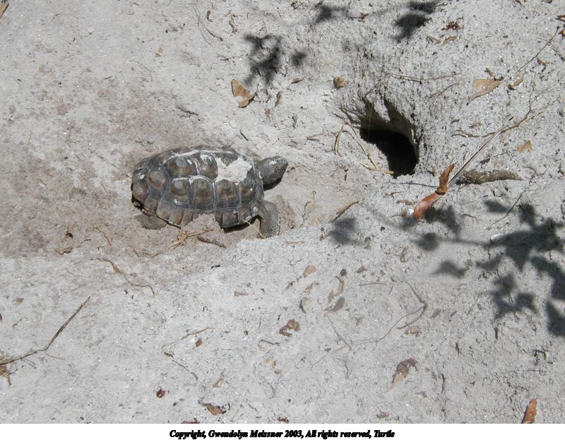 Picture #6: Turtle #6 800x623, 72,055 bytes (71K), (html file) Copyright, Gwendolyn Meissner 2003, All rights reserved Olympus D-510Z camera f/4.4, ISO 131, 1/100 sec, 15.7mm, auto mode, HQ, matrix metering 35mm equivalent focal length 102.0mm Taken by Gwendolyn Meissner Last modified on May 29, 2003 at 10:34 |