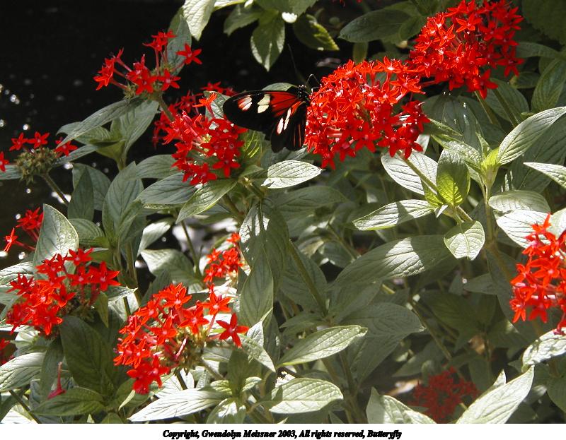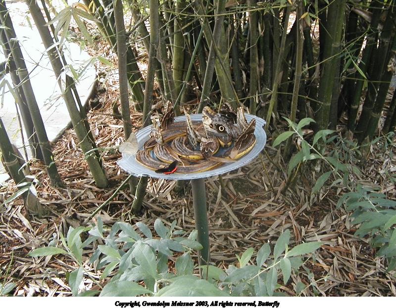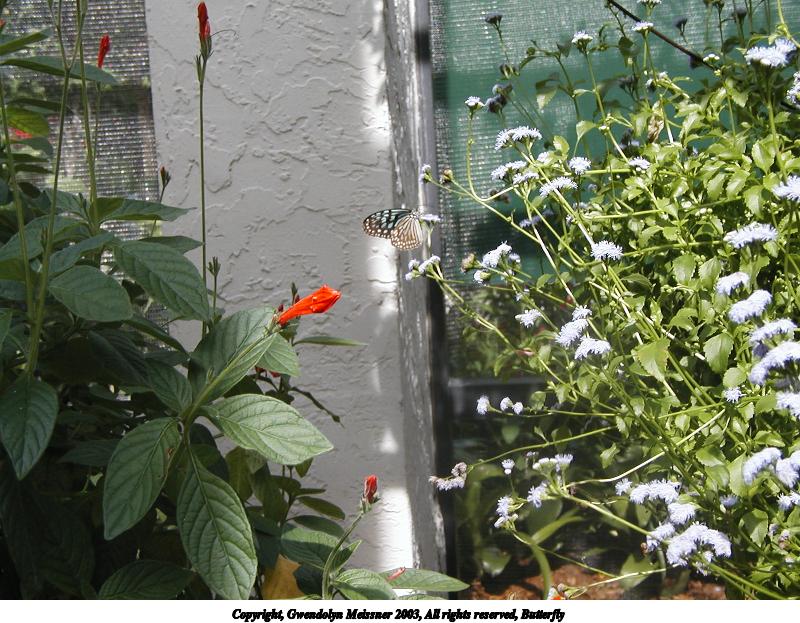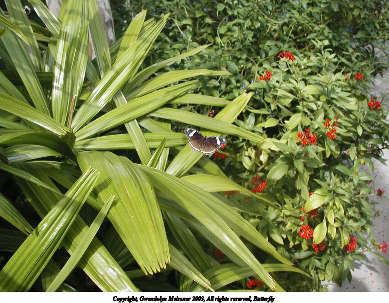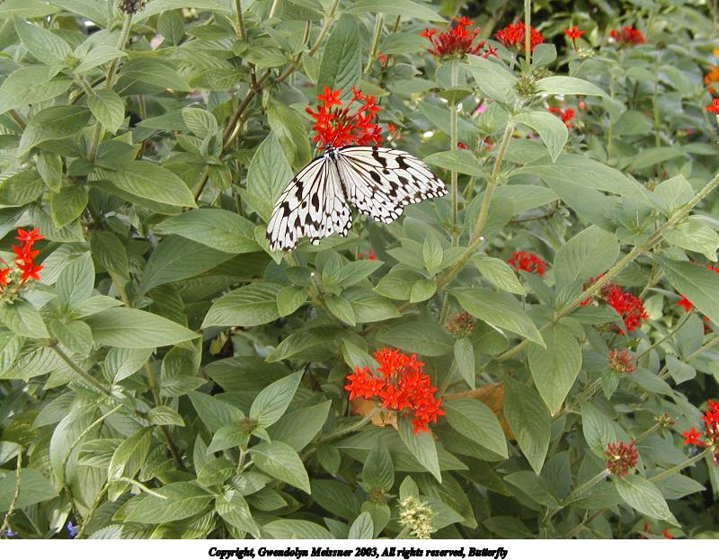 Picture #5: Butterfly #3 800x623, 67,529 bytes (66K), (html file) Copyright, Gwendolyn Meissner 2003, All rights reserved Olympus D-510Z camera f/4.4, ISO 100, flash, 1/650 sec, 15.7mm, auto mode, HQ, matrix metering 35mm equivalent focal length 102.0mm Taken by Gwendolyn Meissner Last modified on May 29, 2003 at 10:34 |