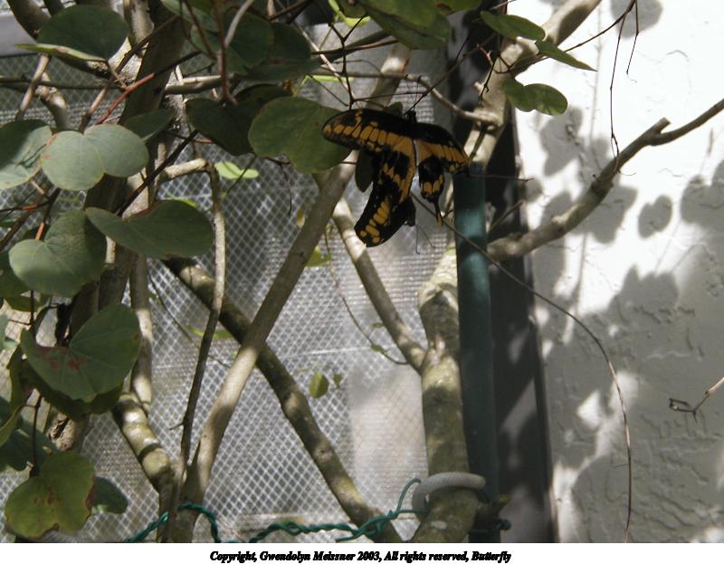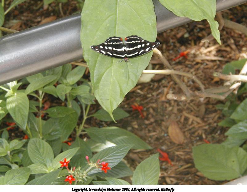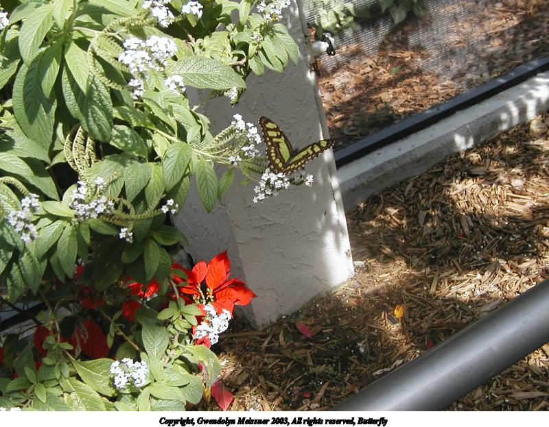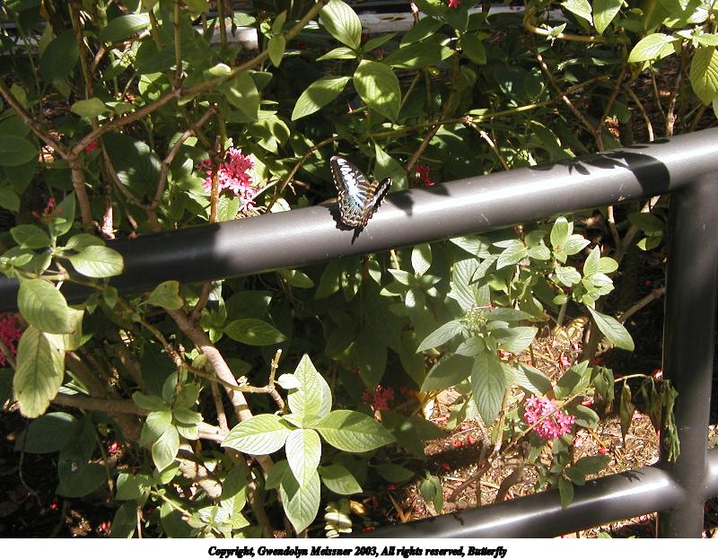 Picture #15: Butterfly #13 800x623, 69,149 bytes (68K), (html file) Copyright, Gwendolyn Meissner 2003, All rights reserved Olympus D-510Z camera f/4.4, ISO 100, 1/200 sec, 15.7mm, auto mode, HQ, matrix metering 35mm equivalent focal length 102.0mm Taken by Gwendolyn Meissner Last modified on May 29, 2003 at 10:34 |