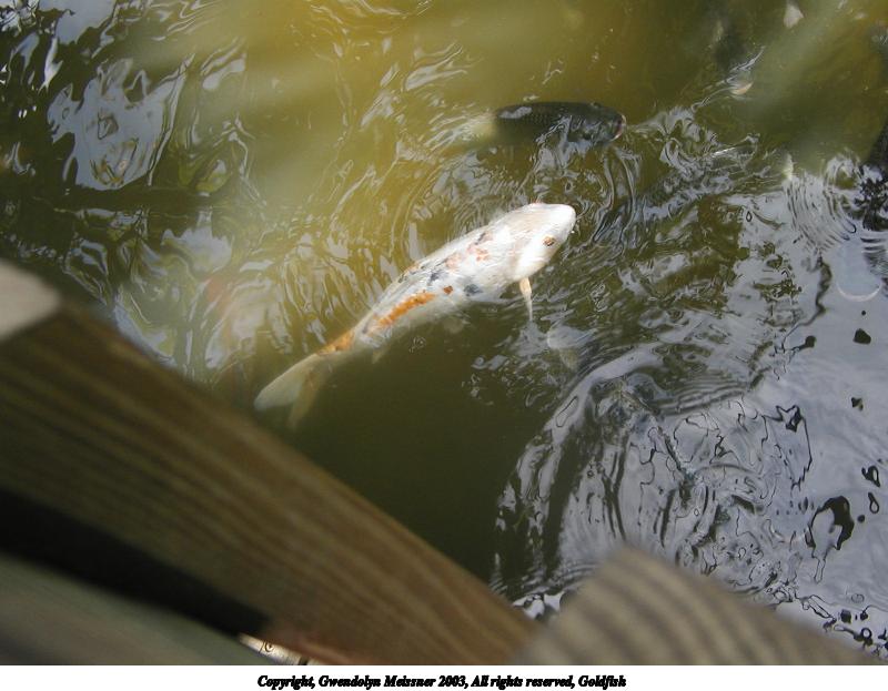 Picture #2: Goldfish 800x623, 70,297 bytes (69K), (html file) Copyright, Gwendolyn Meissner 2003, All rights reserved Olympus D-510Z camera f/3.6, ISO 100, 1/125 sec, 8.5mm, auto mode, HQ, matrix metering 35mm equivalent focal length 55.0mm Taken by Gwendolyn Meissner Last modified on May 29, 2003 at 10:34 |