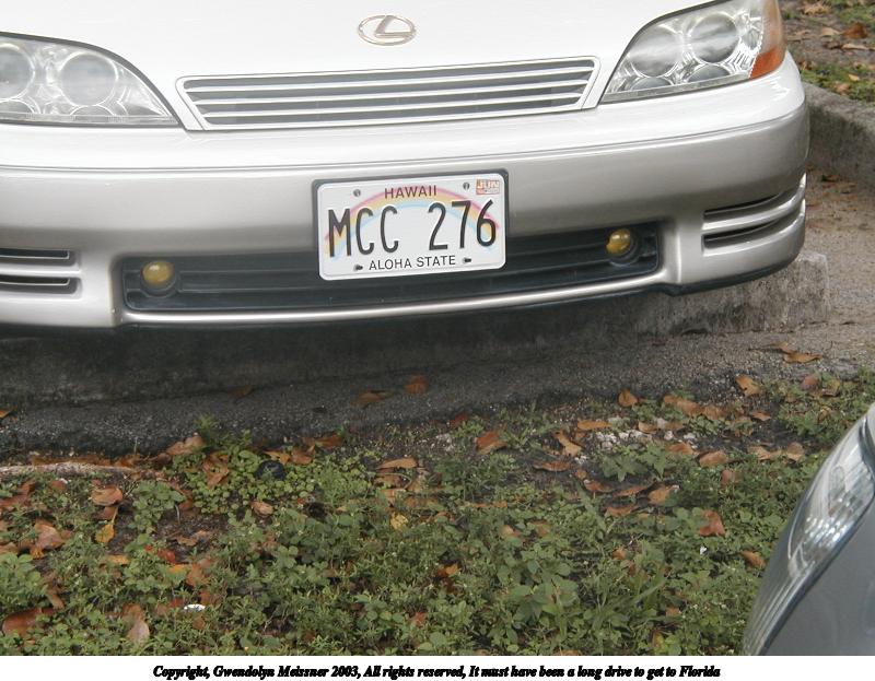 Picture #1: It must have been a long drive to get to Florida 800x623, 98,214 bytes (96K), (html file) Copyright, Gwendolyn Meissner 2003, All rights reserved Olympus D-510Z camera f/4.4, ISO 100, 1/125 sec, 15.7mm, auto mode, HQ, matrix metering 35mm equivalent focal length 102.0mm Taken by Gwendolyn Meissner Last modified on May 29, 2003 at 10:34 |