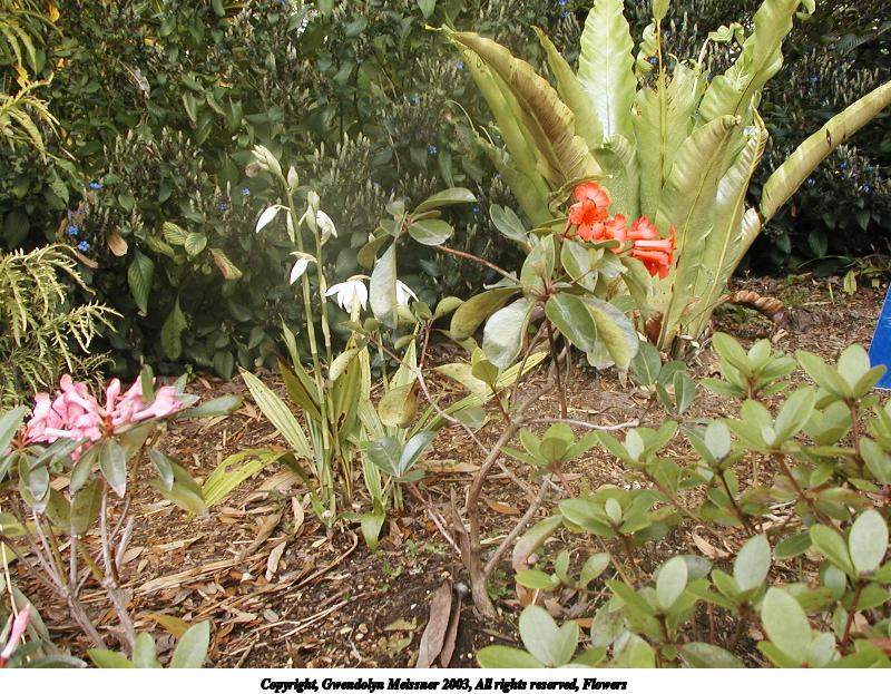Picture #2: Flowers 800x623, 117,578 bytes (115K), (html file) Copyright, Gwendolyn Meissner 2003, All rights reserved Olympus D-510Z camera f/4.4, ISO 200, flash, 1/100 sec, 15.7mm, auto mode, HQ, matrix metering 35mm equivalent focal length 102.0mm Taken by Gwendolyn Meissner Last modified on May 29, 2003 at 10:34 |