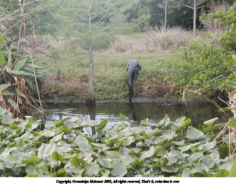 Picture #30: That's it, swim time is over 800x623, 129,707 bytes (127K), (html file) Copyright, Gwendolyn Meissner 2003, All rights reserved Olympus D-510Z camera f/4.4, ISO 124, 1/100 sec, 15.7mm, auto mode, HQ, matrix metering 35mm equivalent focal length 102.0mm Taken by Gwendolyn Meissner Last modified on May 29, 2003 at 10:34 |