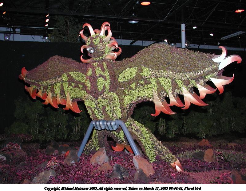 Picture #11: Floral bird 800x623, 120,753 bytes (118K), (html file) Copyright, Michael Meissner 2003, All rights reserved Olympus C-2100UZ camera f/2.8, ISO 100, 1/250 sec, 7.0mm, shutter priority, SHQ, matrix metering 35mm equivalent focal length 39.0mm Taken by Michael Meissner on March 17, 2003 09:44:42 Last modified on March 28, 2003 at 16:02 Shutter speed of 1/125 or 1/250 may indicate use of flash |