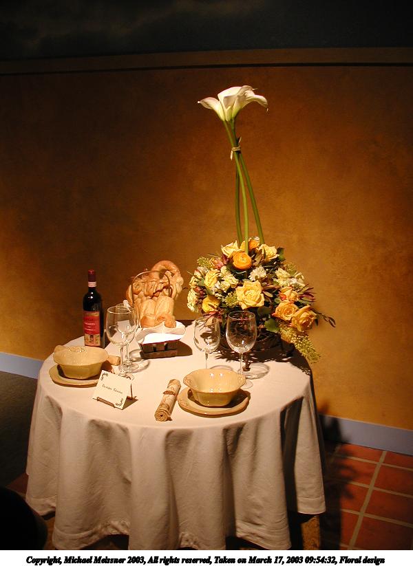 Picture #25: Floral design #8 600x823, 87,858 bytes (86K), (html file) Copyright, Michael Meissner 2003, All rights reserved Olympus C-2100UZ camera f/2.8, ISO 100, 1/125 sec, 11.0mm, auto mode, SHQ, matrix metering 35mm equivalent focal length 61.0mm Taken by Michael Meissner on March 17, 2003 09:59:51 Last modified on March 28, 2003 at 16:02 Shutter speed of 1/125 or 1/250 may indicate use of flash |