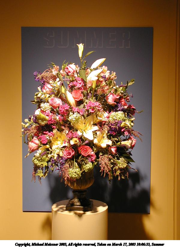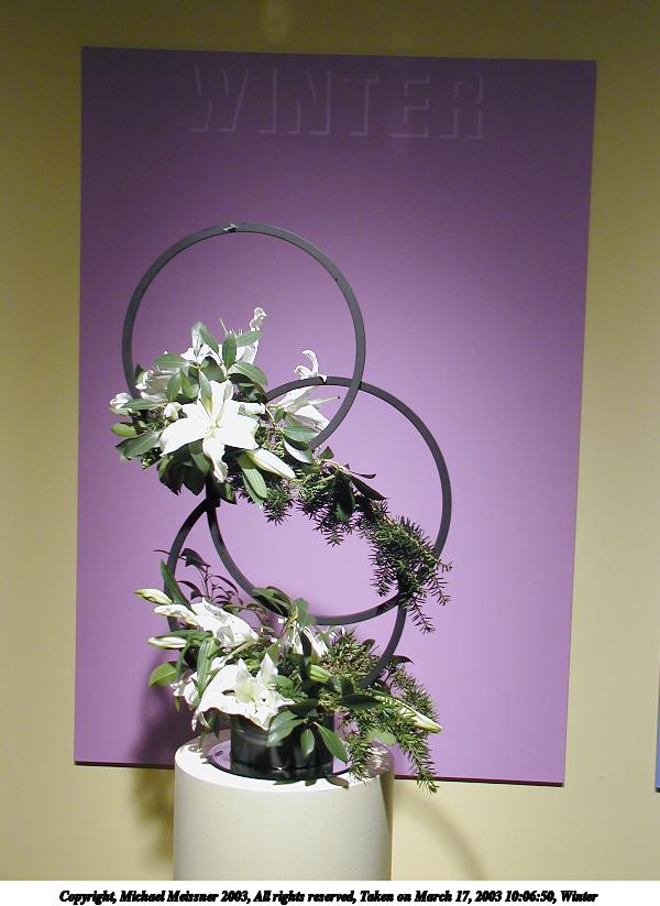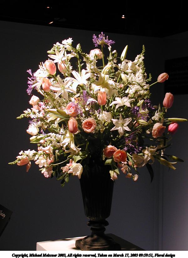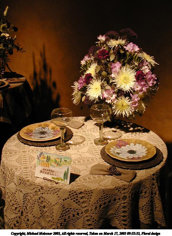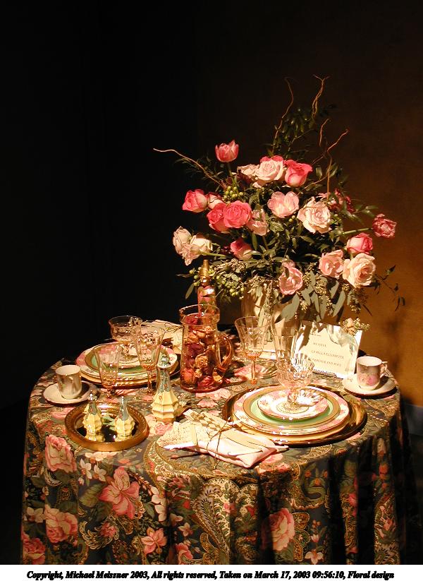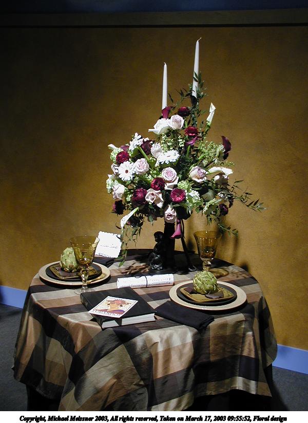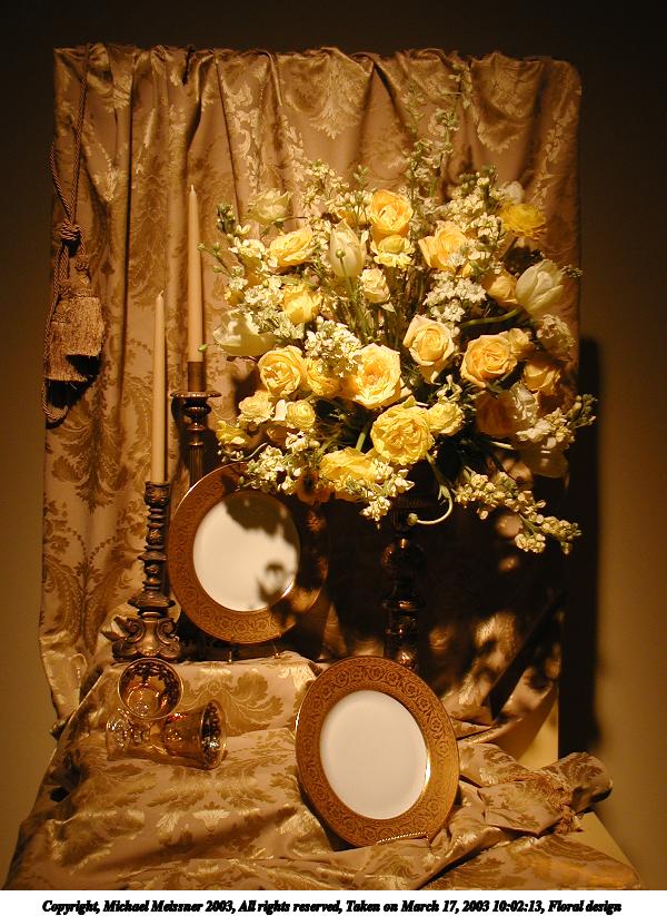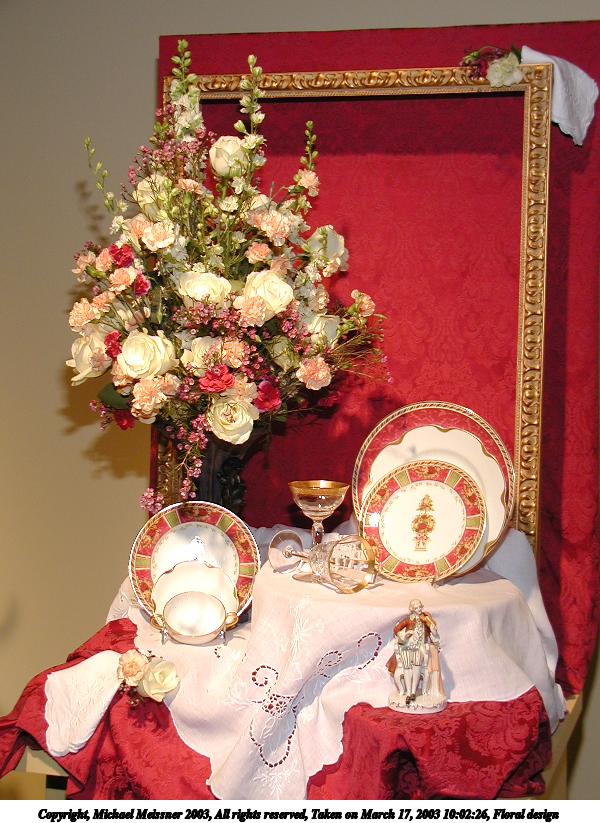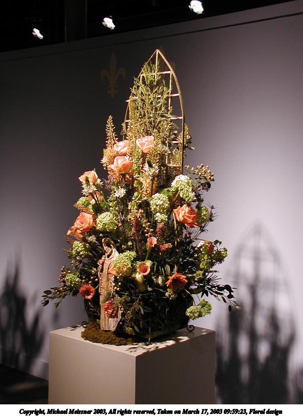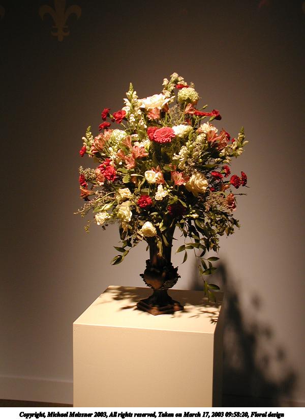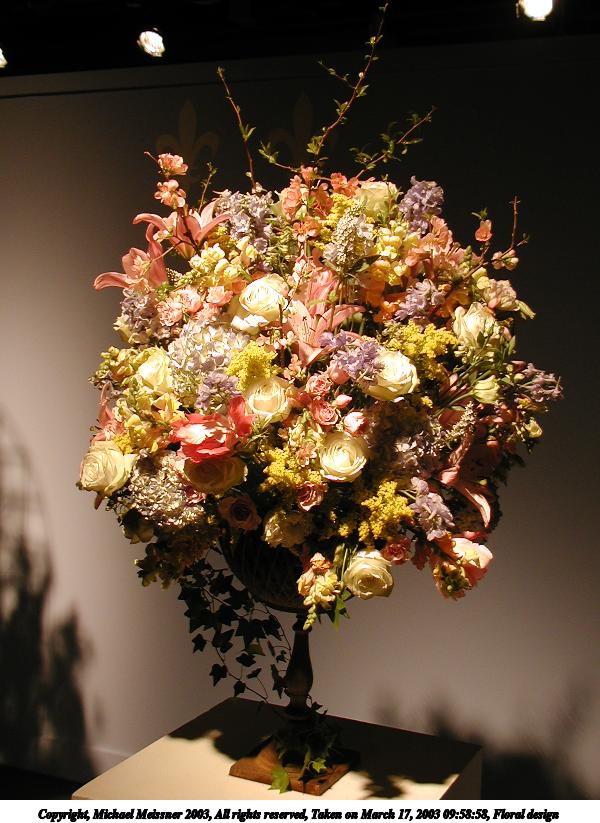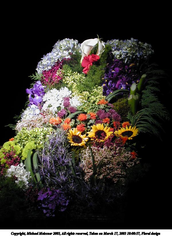 Picture #20: Floral design #3 600x823, 84,196 bytes (83K), (html file) Copyright, Michael Meissner 2003, All rights reserved Olympus C-2100UZ camera f/2.8, ISO 100, 1/125 sec, 9.0mm, auto mode, SHQ, matrix metering 35mm equivalent focal length 50.0mm Taken by Michael Meissner on March 17, 2003 09:55:52 Last modified on March 28, 2003 at 16:02 Shutter speed of 1/125 or 1/250 may indicate use of flash |