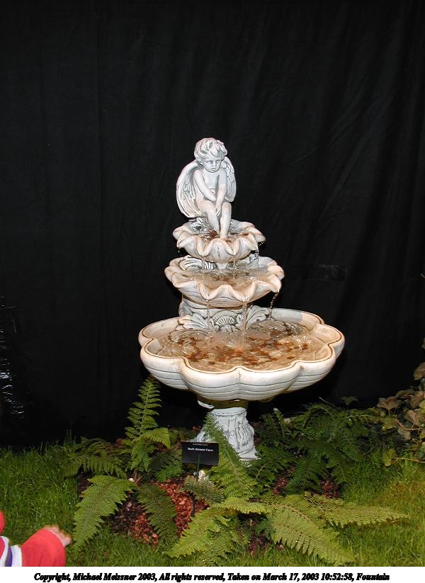 Picture #10: Fountain 600x823, 146,286 bytes (143K), (html file) Copyright, Michael Meissner 2003, All rights reserved Olympus C-2100UZ camera f/2.8, ISO 100, 1/250 sec, 7.0mm, shutter priority, SHQ, matrix metering 35mm equivalent focal length 39.0mm Taken by Michael Meissner on March 17, 2003 09:42:15 Last modified on March 28, 2003 at 16:02 Shutter speed of 1/125 or 1/250 may indicate use of flash |