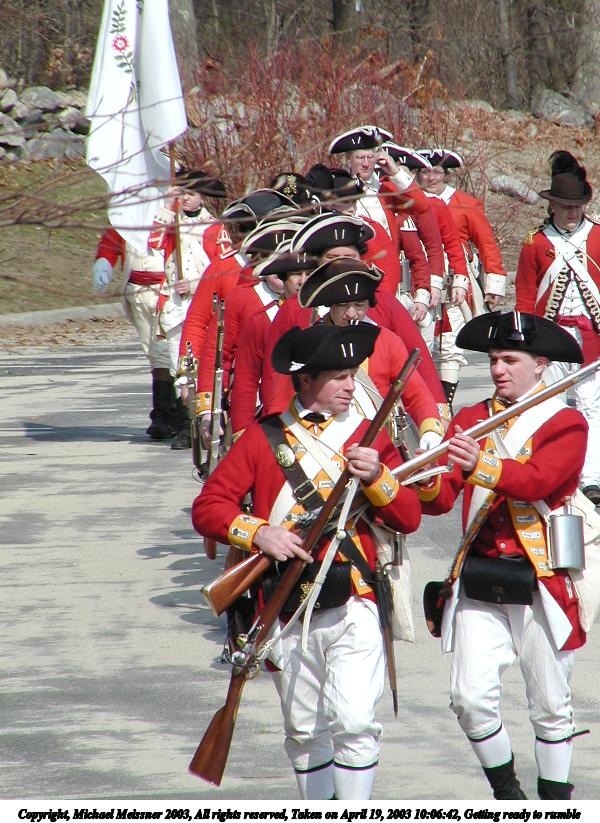 Picture #19: Preparing to meet the British regulars 800x623, 164,805 bytes (161K), (html file) Copyright, Michael Meissner 2003, All rights reserved Olympus C-2100UZ camera f/4.0, ISO 100, 1/200 sec, 70.0mm, shutter priority, SHQ, matrix metering 35mm equivalent focal length 388.0mm Taken by Michael Meissner on April 19, 2003 11:45:13 Last modified on May 05, 2003 at 23:14 |