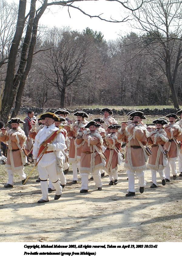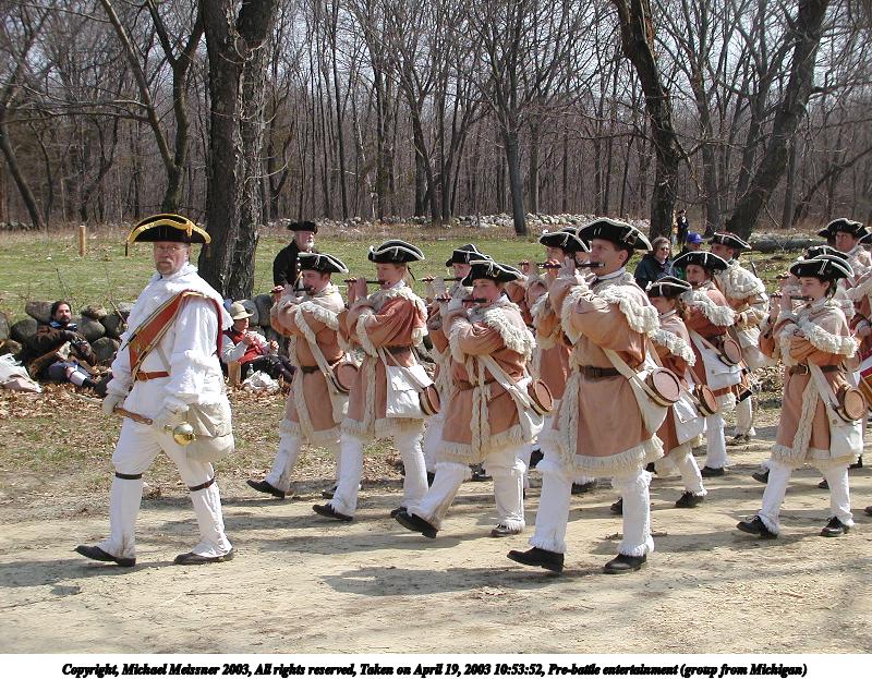 Picture #42: Pre-battle entertainment (group from Michigan) 600x846, 164,760 bytes (161K), (html file) Copyright, Michael Meissner 2003, All rights reserved Olympus C-2100UZ camera f/4.5, ISO 100, 1/250 sec, 17.9mm, shutter priority, SHQ, matrix metering 35mm equivalent focal length 99.0mm Taken by Michael Meissner on April 19, 2003 10:53:41 Last modified on May 05, 2003 at 23:14 Shutter speed of 1/125 or 1/250 may indicate use of flash |