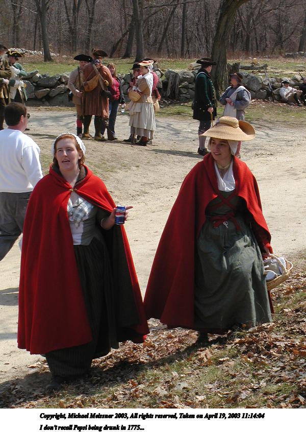 Picture #30: I don't recall Pepsi being drunk in 1775... 600x846, 119,897 bytes (118K), (html file) Copyright, Michael Meissner 2003, All rights reserved Olympus C-2100UZ camera f/5.6, ISO 100, 1/160 sec, 16.8mm, aperture priority, SHQ, matrix metering 35mm equivalent focal length 93.0mm Taken by Michael Meissner on April 19, 2003 11:14:04 Last modified on May 05, 2003 at 23:14 |