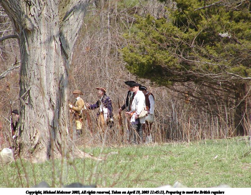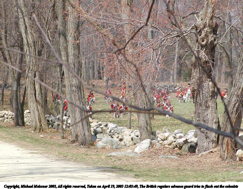 Picture #10: The British regulars advance guard tries to flush out the colonists 800x623, 180,579 bytes (177K), (html file) Copyright, Michael Meissner 2003, All rights reserved Olympus C-2100UZ camera f/4.5, ISO 100, 1/160 sec, 34.1mm, shutter priority, SHQ, matrix metering 35mm equivalent focal length 189.0mm Taken by Michael Meissner on April 19, 2003 12:03:49 Last modified on May 05, 2003 at 23:14 |