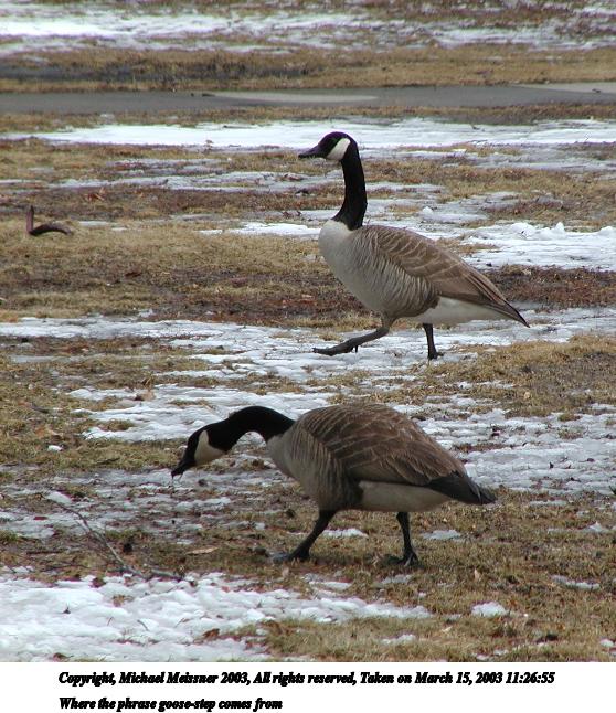 Picture #102: Where the phrase goose-step comes from 558x646, 95,997 bytes (94K), (html file) Copyright, Michael Meissner 2003, All rights reserved Olympus C-2100UZ camera f/5.6, ISO 100, 1/500 sec, 70.0mm, auto mode, SHQ, matrix metering 35mm equivalent focal length 388.0mm Taken by Michael Meissner on March 15, 2003 11:26:55 Last modified on March 28, 2003 at 09:10 |