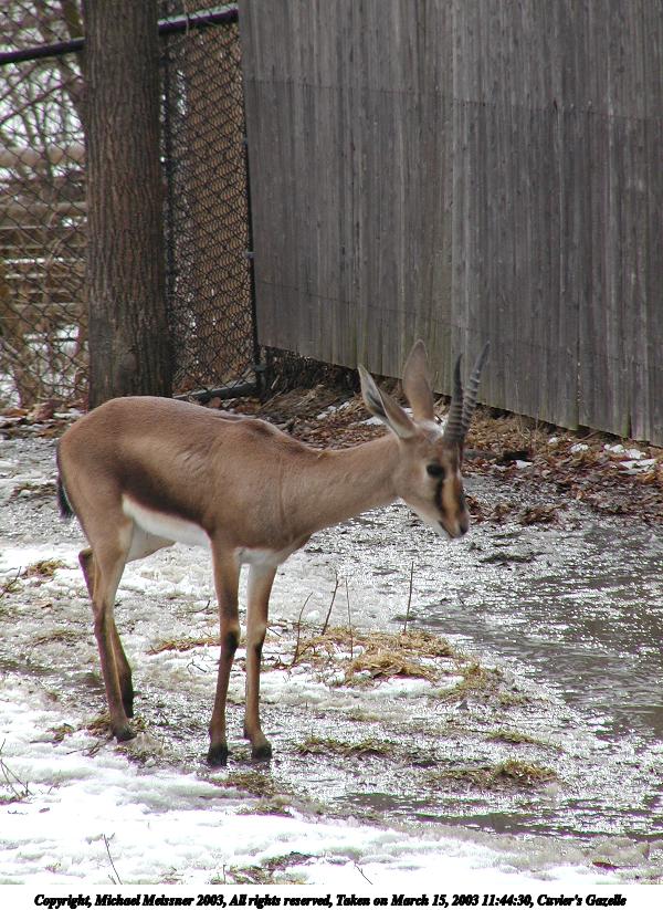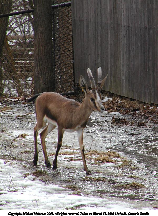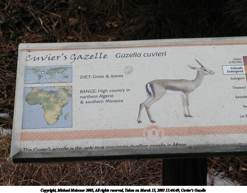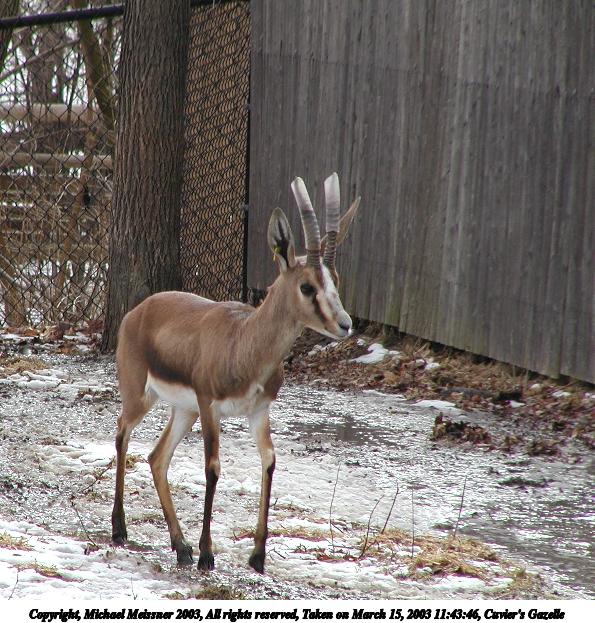 Picture #99: Cuvier's Gazelle #2 600x823, 151,999 bytes (149K), (html file) Copyright, Michael Meissner 2003, All rights reserved Olympus C-2100UZ camera f/5.6, ISO 100, 1/250 sec, 70.0mm, aperture priority, SHQ, matrix metering 35mm equivalent focal length 388.0mm Taken by Michael Meissner on March 15, 2003 11:44:17 Last modified on March 28, 2003 at 09:10 Shutter speed of 1/125 or 1/250 may indicate use of flash |