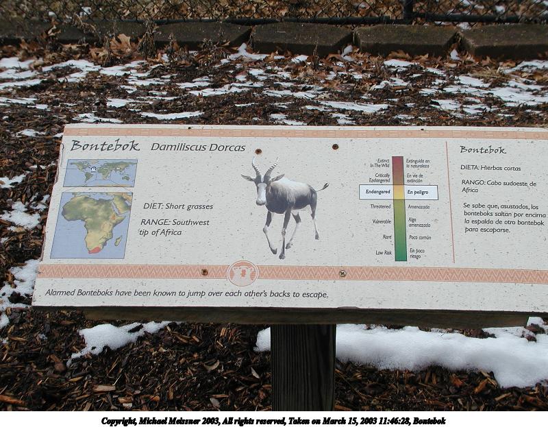 Picture #94: Bontebok #2 800x623, 129,577 bytes (127K), (html file) Copyright, Michael Meissner 2003, All rights reserved Olympus C-2100UZ camera f/5.6, ISO 100, 1/500 sec, 11.3mm, aperture priority, SHQ, matrix metering 35mm equivalent focal length 63.0mm Taken by Michael Meissner on March 15, 2003 11:46:28 Last modified on March 28, 2003 at 09:10 |