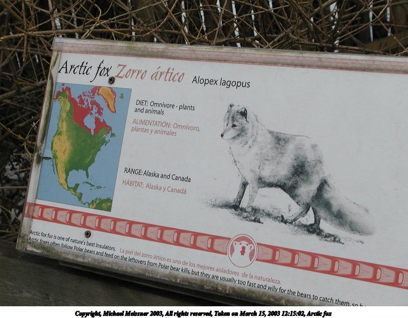 Picture #71: Arctic fox #3 800x623, 75,036 bytes (74K), (html file) Copyright, Michael Meissner 2003, All rights reserved Olympus C-2100UZ camera f/4.5, ISO 100, 1/650 sec, 48.3mm, auto mode, SHQ, cloudy, matrix metering 35mm equivalent focal length 268.0mm Taken by Michael Meissner on March 15, 2003 12:15:24 Last modified on March 28, 2003 at 09:10 |