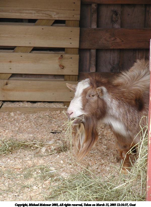 Picture #69: Goat #2 600x823, 104,197 bytes (102K), (html file) Copyright, Michael Meissner 2003, All rights reserved Olympus C-2100UZ camera f/2.8, ISO 100, 1/125 sec, 32.5mm, auto mode, SHQ, matrix metering 35mm equivalent focal length 180.0mm Taken by Michael Meissner on March 15, 2003 12:16:37 Last modified on March 28, 2003 at 09:10 Shutter speed of 1/125 or 1/250 may indicate use of flash |