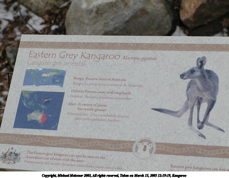 Picture #60: Kangaroo #3 800x623, 167,453 bytes (164K), (html file) Copyright, Michael Meissner 2003, All rights reserved Olympus C-2100UZ camera f/3.2, ISO 100, 1/500 sec, 25.2mm, auto mode, SHQ, matrix metering 35mm equivalent focal length 140.0mm Taken by Michael Meissner on March 15, 2003 12:19:24 Last modified on March 28, 2003 at 09:10 |