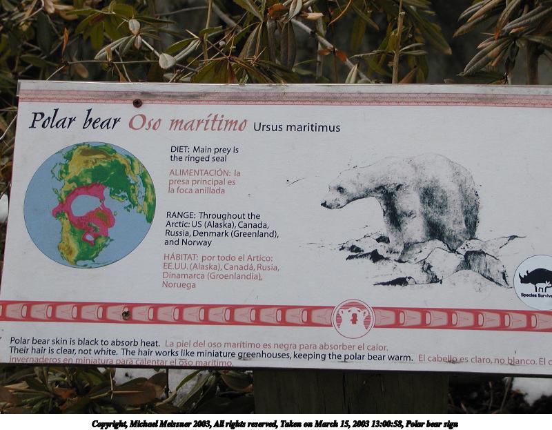 Picture #43: Polar bear sign 800x623, 93,932 bytes (92K), (html file) Copyright, Michael Meissner 2003, All rights reserved Olympus C-2100UZ camera f/3.2, ISO 100, 1/650 sec, 16.2mm, auto mode, SHQ, matrix metering 35mm equivalent focal length 90.0mm Taken by Michael Meissner on March 15, 2003 13:00:58 Last modified on March 28, 2003 at 09:10 |