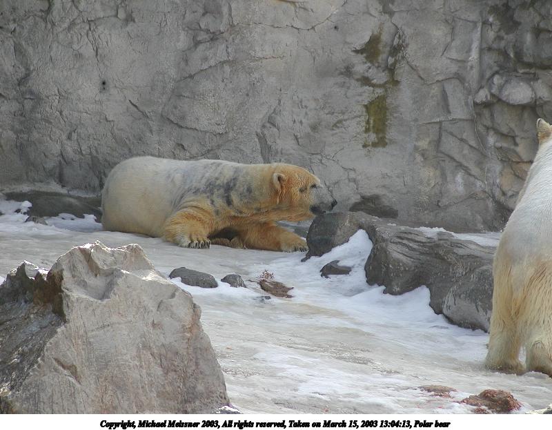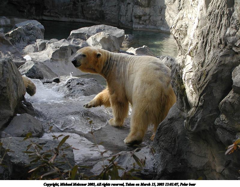 Picture #34: Polar bear #2 800x623, 89,207 bytes (88K), (html file) Copyright, Michael Meissner 2003, All rights reserved Olympus C-2100UZ camera f/3.2, ISO 100, 1/500 sec, 35.7mm, auto mode, SHQ, matrix metering 35mm equivalent focal length 198.0mm Taken by Michael Meissner on March 15, 2003 13:04:13 Last modified on March 28, 2003 at 09:10 |