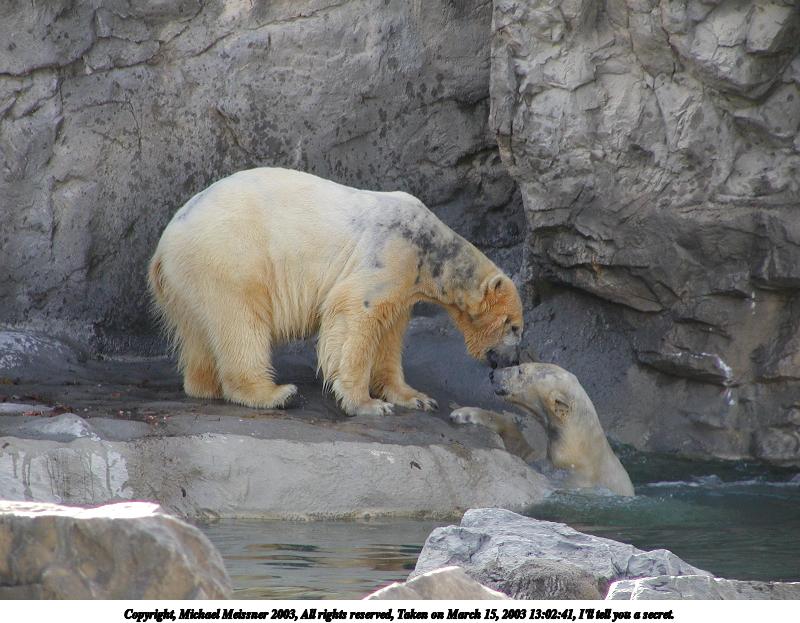 Picture #36: I'll tell you a secret. 800x623, 91,880 bytes (90K), (html file) Copyright, Michael Meissner 2003, All rights reserved Olympus C-2100UZ camera f/2.8, ISO 100, 1/250 sec, 45.8mm, auto mode, SHQ, matrix metering 35mm equivalent focal length 254.0mm Taken by Michael Meissner on March 15, 2003 13:02:41 Last modified on March 28, 2003 at 09:10 Shutter speed of 1/125 or 1/250 may indicate use of flash |