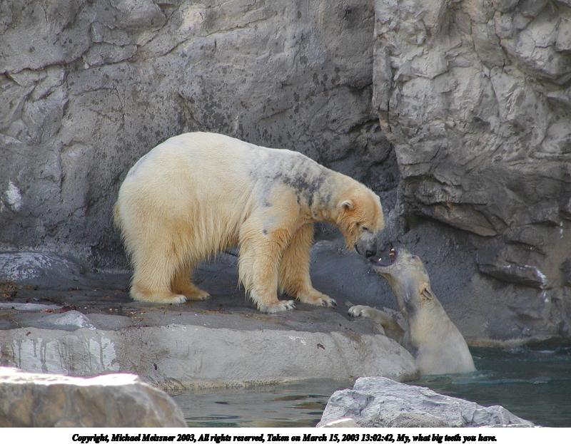 Picture #35: My, what big teeth you have. 800x623, 91,856 bytes (90K), (html file) Copyright, Michael Meissner 2003, All rights reserved Olympus C-2100UZ camera f/2.8, ISO 100, 1/250 sec, 45.8mm, auto mode, SHQ, matrix metering 35mm equivalent focal length 254.0mm Taken by Michael Meissner on March 15, 2003 13:02:42 Last modified on March 28, 2003 at 09:10 Shutter speed of 1/125 or 1/250 may indicate use of flash |