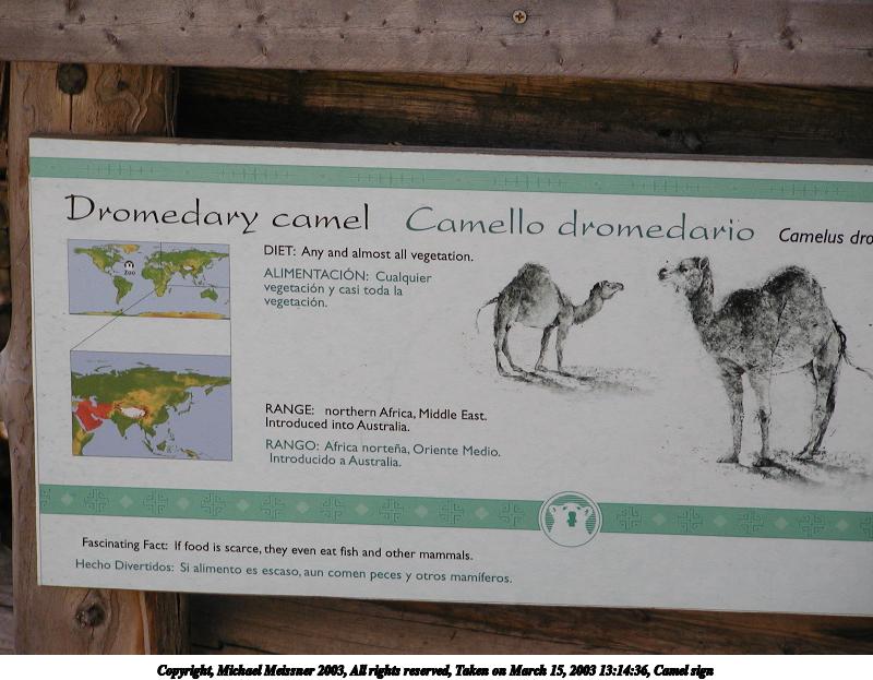 Picture #25: Camel sign 800x623, 77,894 bytes (77K), (html file) Copyright, Michael Meissner 2003, All rights reserved Olympus C-2100UZ camera f/2.8, ISO 100, 1/400 sec, 31.1mm, auto mode, SHQ, matrix metering 35mm equivalent focal length 173.0mm Taken by Michael Meissner on March 15, 2003 13:14:36 Last modified on March 28, 2003 at 09:10 |